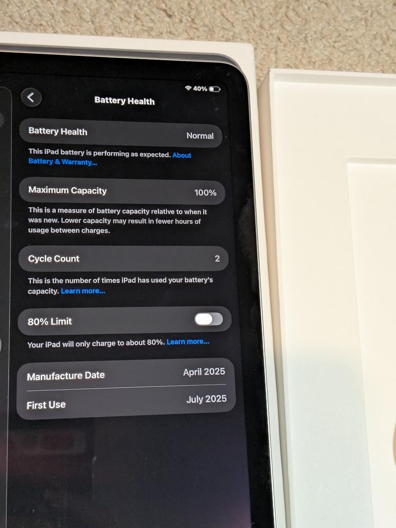 Battery health is 100% with only 2 charge cycles — practically brand new.