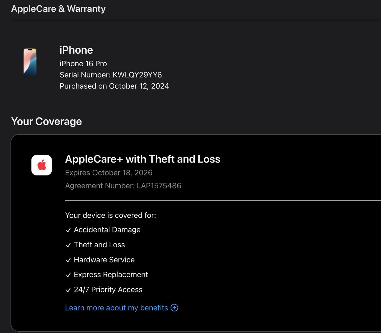 New, unused (not refurbished). Just received directly from Apple as a warranty replacement. Absolutely nothing wrong with it. 1 year of Applecare+ with Theft and Loss (expires Oct 18, 2026). iPhone box included.