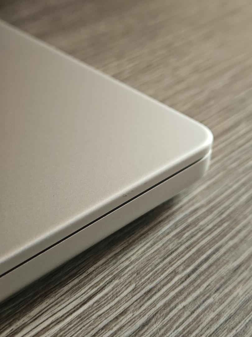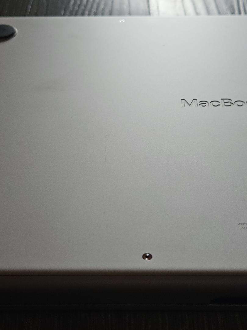 small hairline scratch on the bottom, some light scuffs around edges and ports, corner by HDMI port is slightly bent, keys have some wear, scratches on the charger