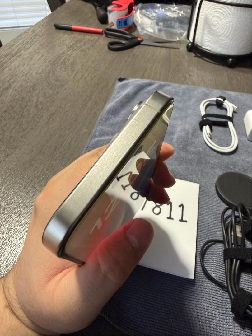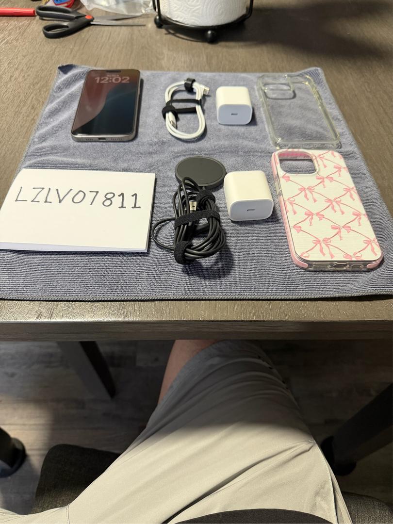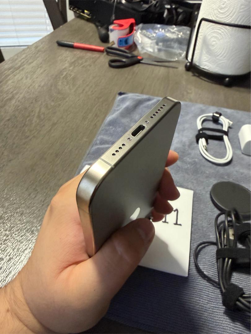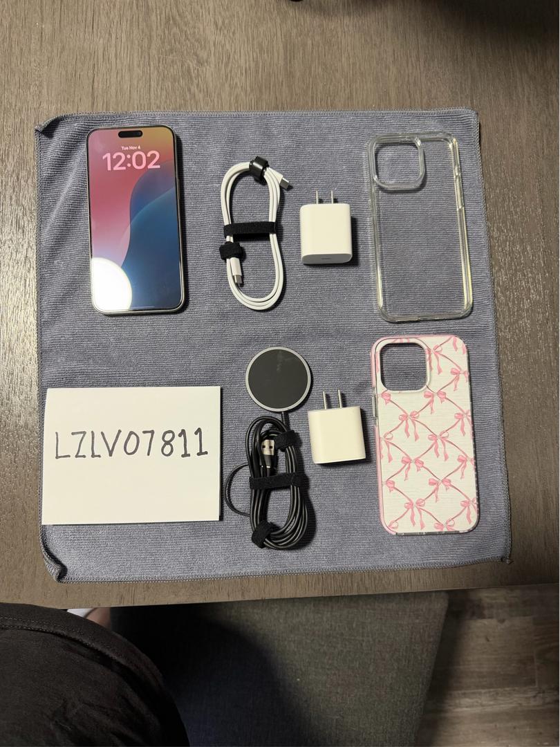 I have an iPhone 15 Pro Max Unlocked in Natural Titanium with 256GB of storage. The device has 100% battery health with 29 charges. The device is also on iOS 26.0. The device was bought as a second device, but it was never used. During a move, the box was lost, but I will include two charging blocks, one for the iPhone and one for the wireless charger, which I am including as well. There will be two cases, one clear and one pink bow. The device is in mint condition with no signs of wear or tear. The best offer takes it, but please be reasonable with your offers, considering the Swappa fees and PayPal fees plus the shipping.