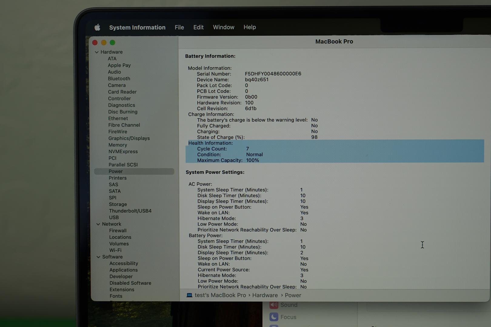 Battery: 100% health, only 7 cycles