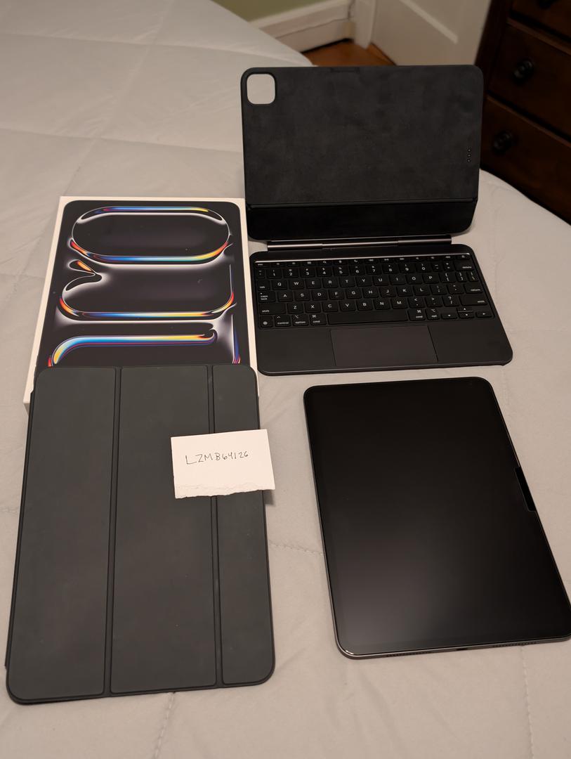 Comes with iPad pro 11-in m4 512 GB, Apple folio, magic keyboard that has metal casing and trackpad from Apple, cable. Original iPad box.