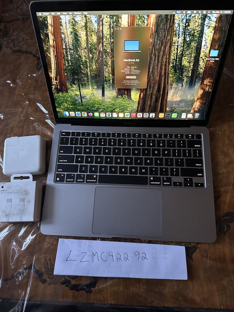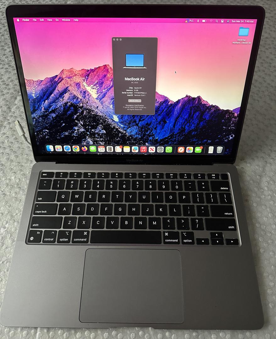 This is a used M1 MacBook Air 2020 with the M1 chip. It has 8GB of RAM and 256 GB of SSD. There is normal wear, and good condition overall. It includes a brand new in box Apple charging cable with 240W and braided, and a MacBook Pro charging brick. No box is included, just the MacBook, cable, and brick.