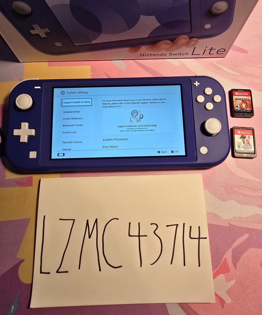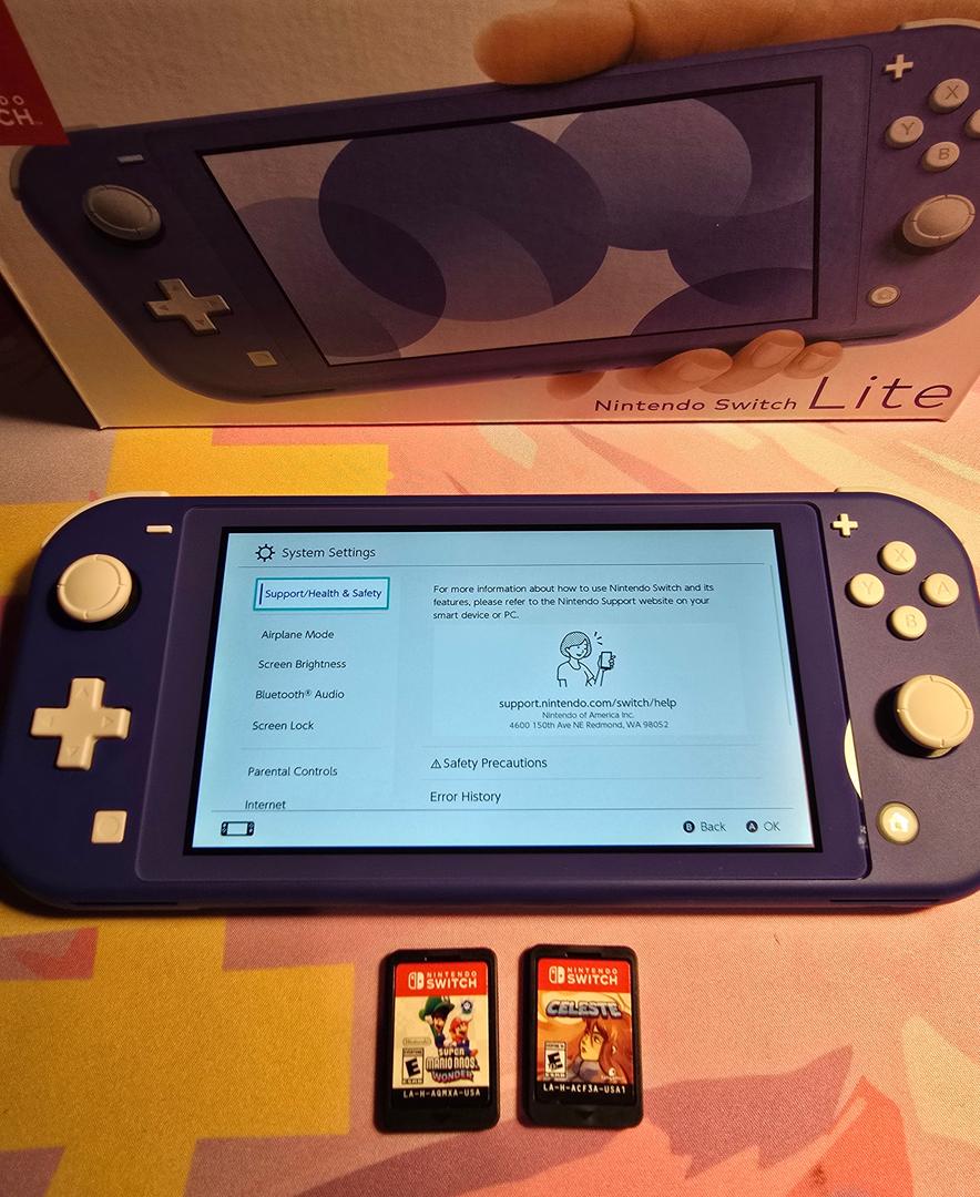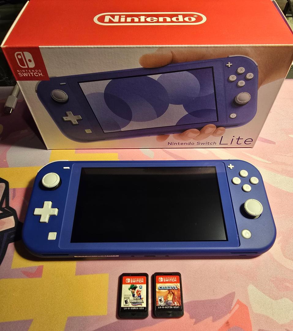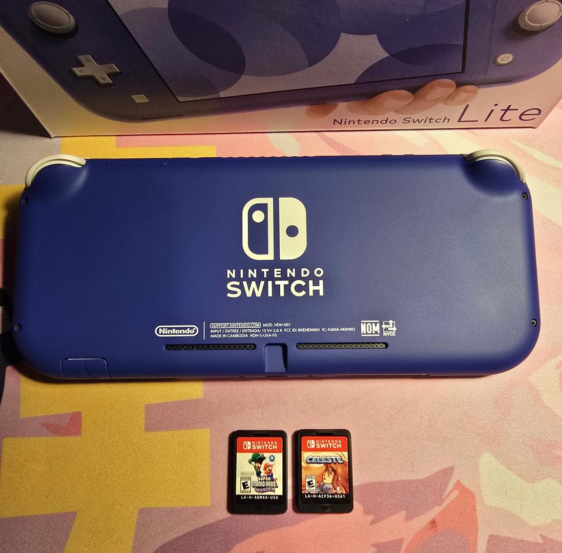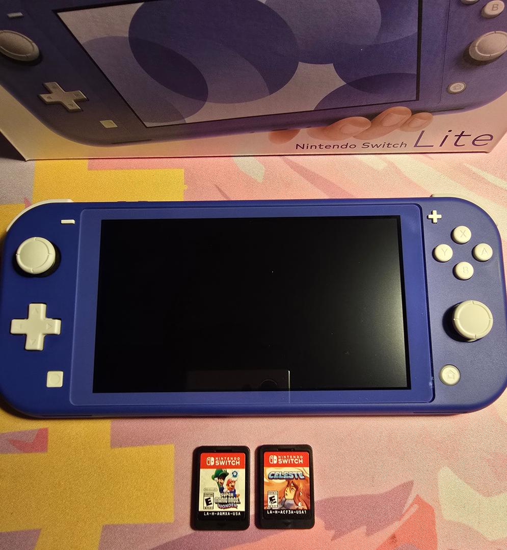 This is an opportunity to get a beautiful mint condition Nintendo Switch Lite at a great deal! This device was purchased recently and used VERY lightly for testing and review content. This incredible device is in excellent condition and functions perfectly. Comes with box, original charger, and TWO GAMES: Super Mario Bros Wonder and Celeste!