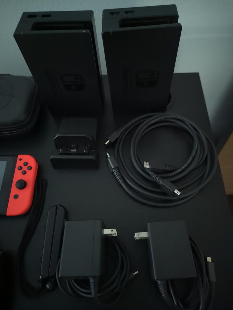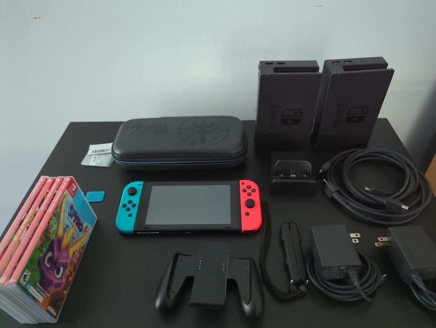 Nintendo Switch, 2 docks, carrying case, 4 games