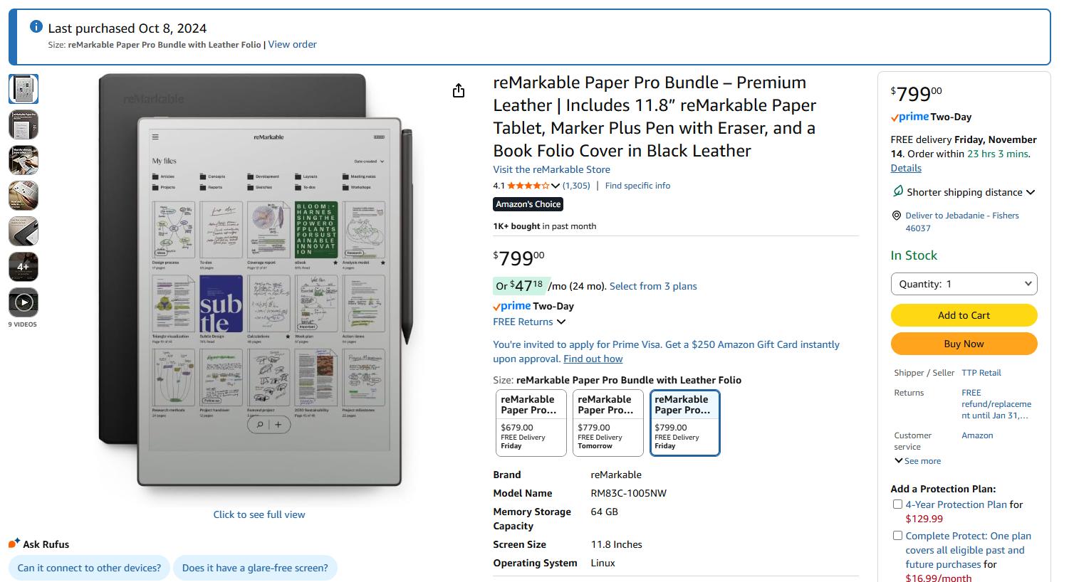 ReMarkable Paper Pro Bundle – Premium Leather | Includes 11.8” remarkable Paper Tablet, Marker Plus Pen with Eraser, and a Book Folio Cover in Black Leather - Bought on Oct 08 2024 and it is not used as it was purchased for my daughter but she refuse to use as as she wants to use the iPad.