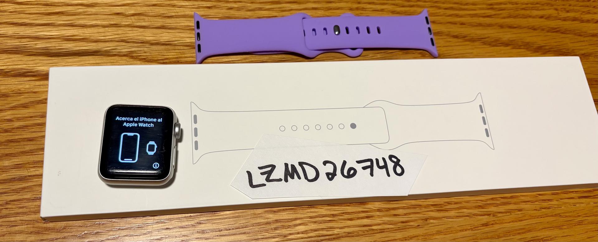Included: Preowned Apple Watch 3 and genuine new in box Apple sport band (white, 41mm). I can also include a purple sport band (unused) if interested. Does not come with Apple Watch box or charging cable. Watch charges fully and lasts a day (might need to charge before bed depending on how much you use it.)