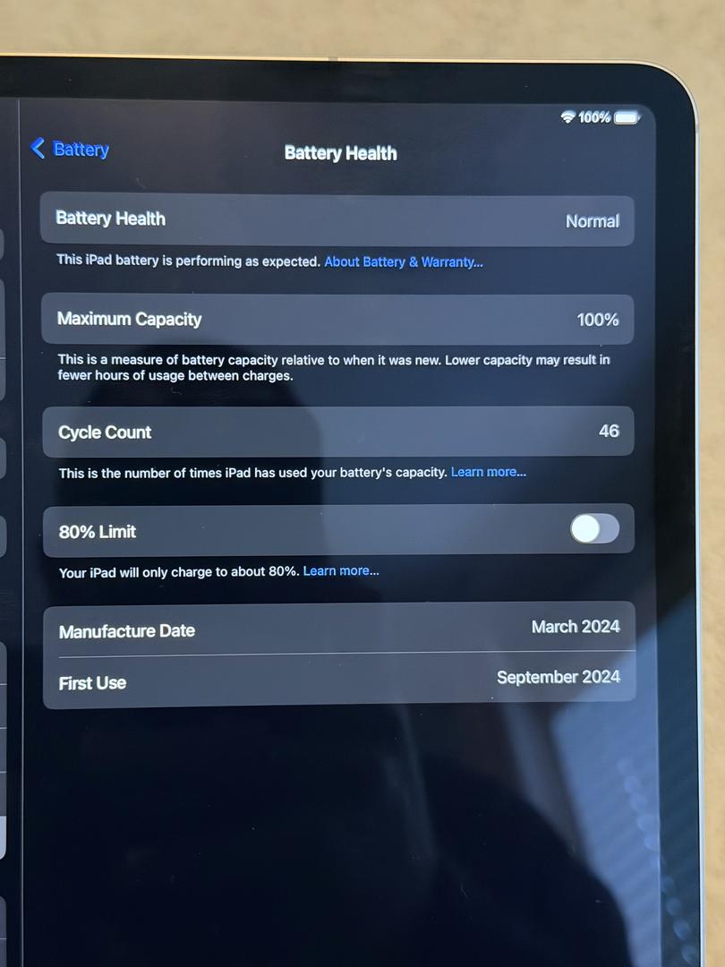 Battery health is normal with cycle count of 46. First used September 2024. No problems activating and device was not activated on cellular. Currently unlocked.