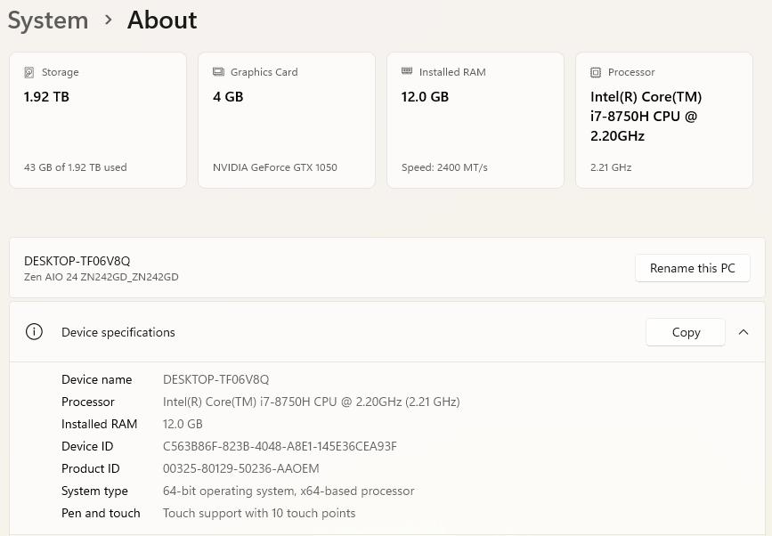 Processor: Intel Core i7-8750H @ 2.20 GHz