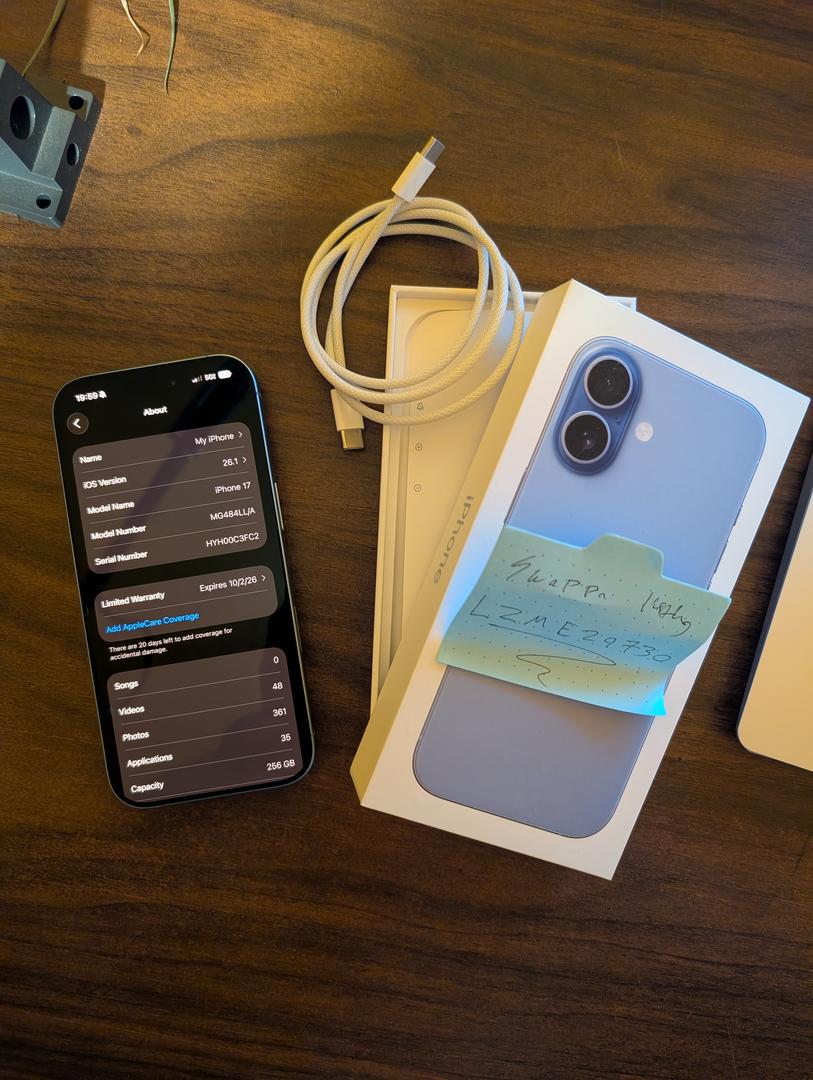 My iPhone 17 is in perfect condition, save for a very minor mark on its aluminum frame. The rest of the phone is pristine. I purchased the phone on October 2nd. It comes with its original box and the nice braded usb-c to usb-c cable.