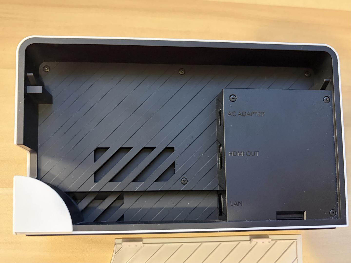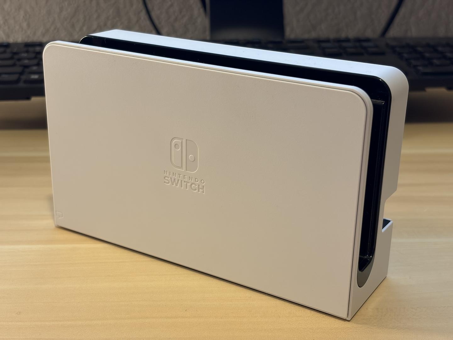 The included official Nintendo dock is white and has an ethernet port. Also includes genuine Nintendo AC adapter.