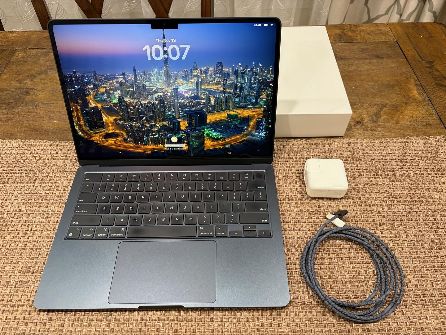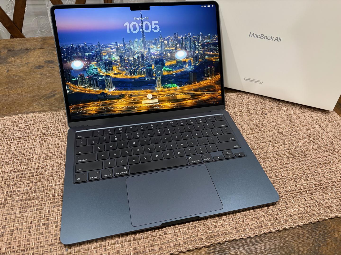 Well cared for MacBook Air 13" with Original Packaging, Original 30W Apple Power Brick, Original Apple MagSafe 2 Midnight color coded braided cable. MacBook Air was purchased from Apple.com - Certified Refurbished section. Battery health is sitting at a very healthy 99% battery health, as was only sparingly used.