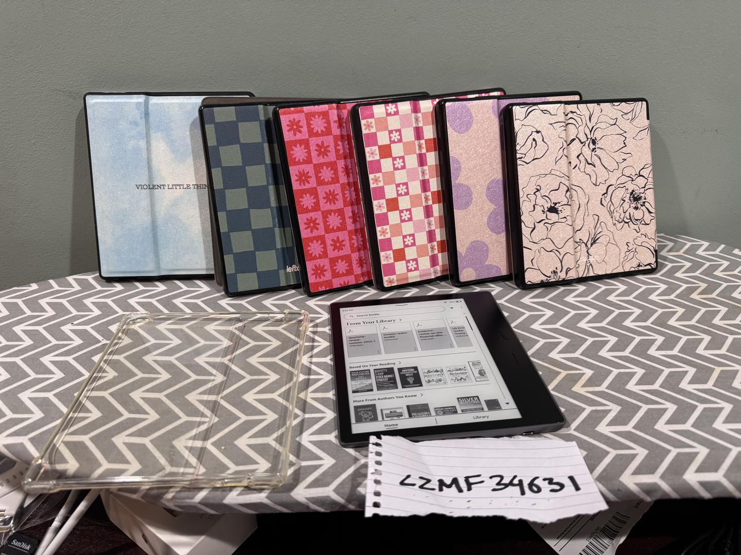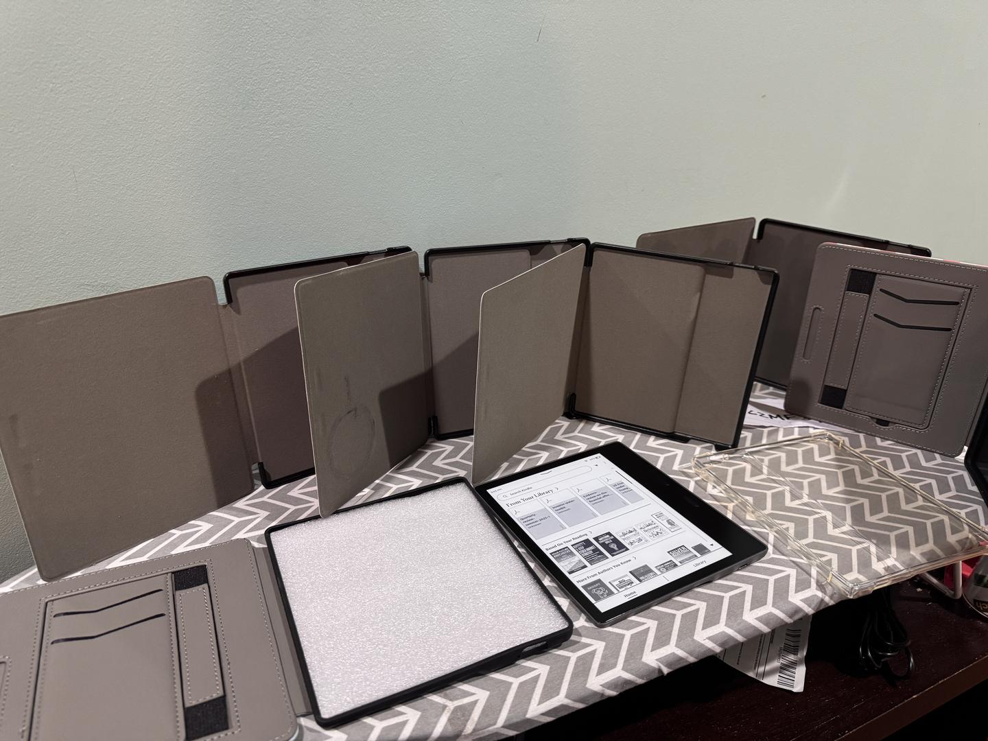 Amazing condition Kindle Oasis with several folio cases.comes with 6 folio cases, one of them is new and a regular clear case.