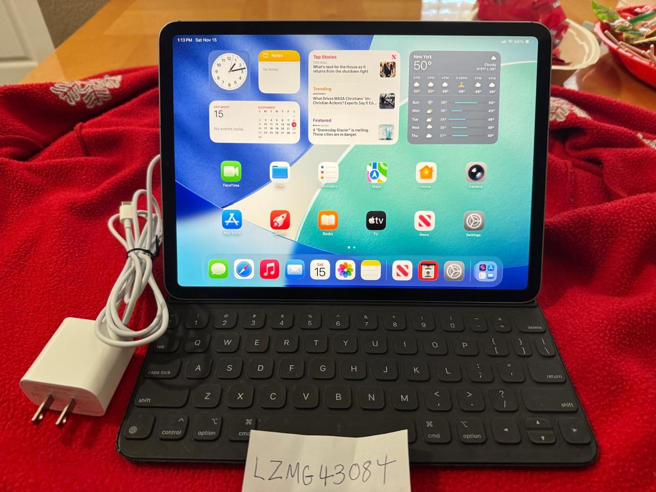 Comes with a 20w charger and Apple keyboard case.