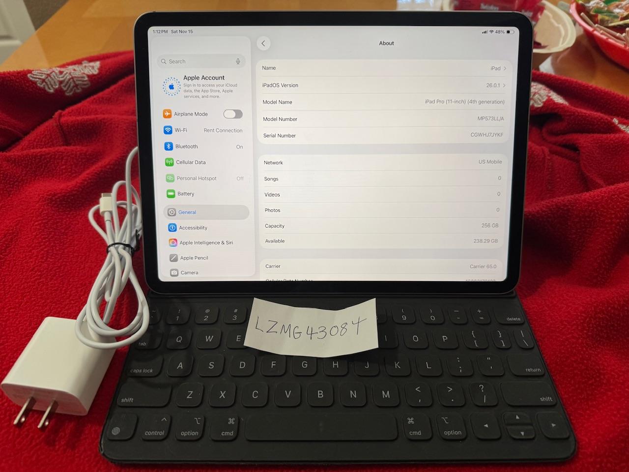 256 GB WiFi + Cellular ,Comes with Apple folio keyboard case.