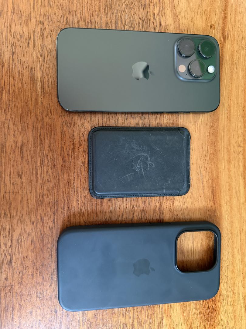 Brand new black silicone apple case + slightly worn but fully functional black mag safe apple wallet included.