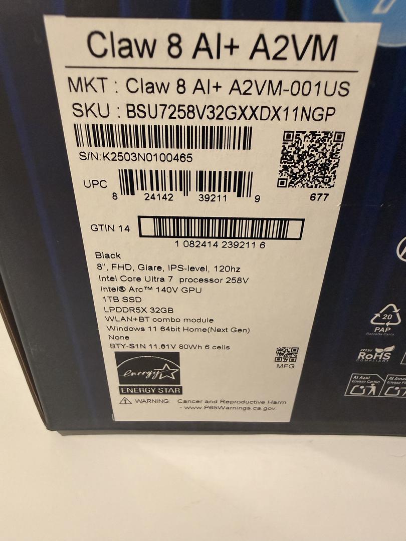MSI CLAW 8 AI+ A2VM-001US 120Hz FHD Gaming Handheld, 8" FHD+ 16:10 (1920x1200) 120Hz 100% sRGB IPS-level Touch Screen, Intel Core Ultra 7-258V (2.2-4.8 GHz), Intel Arc Graphics 140V 8 X-Cores, 32GB LPDDR5x-8533MHz, 1TB NVMe SSD Gen4x4 2230, 2 x Thunderbolt 4 Type-C Port, Intel Wi-Fi 7 BE201 with Bluetooth 5.4, Micro SD 4.0 card reader, 1 x Audio Combo (1/8"), 2 x 2W Speakers Hi-Res, Hall Effect Joysticks and Triggers, 65W AC Power Adaptor.