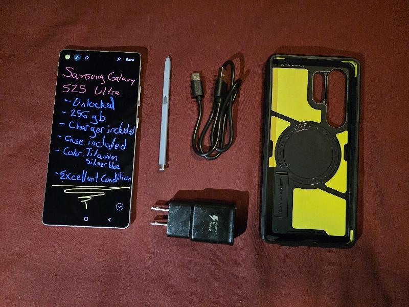Samsung Galaxy S25 Ultra, Unlocked, 256gb, Titanium Silverblue, Excellent Condition. I bought a case along with the phone, and it's never out of the case. It works as good as new, and doesn't have any cracks or scratches. The case and a fast charger comes with it. It's a Spigen case and has a built in kickstand I use to watch videos.