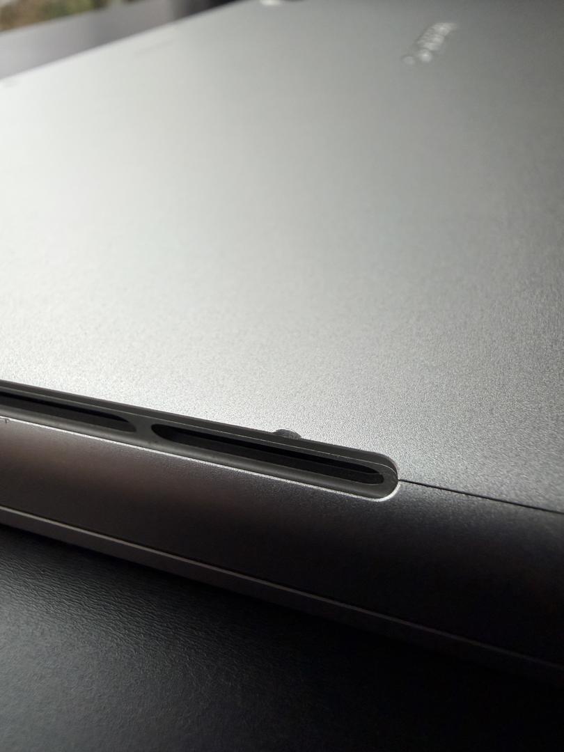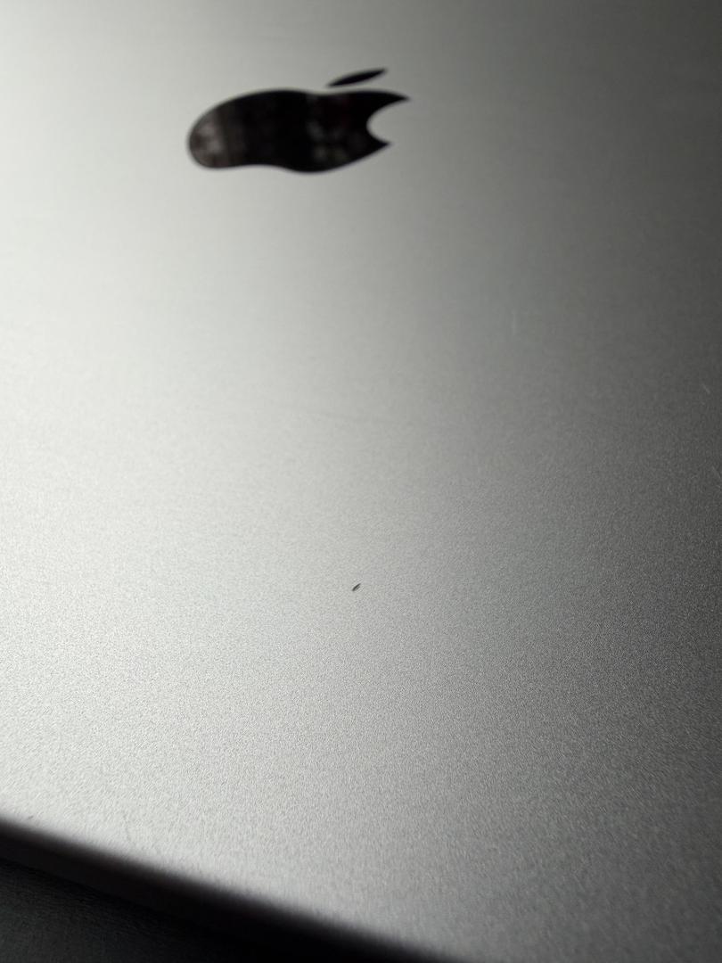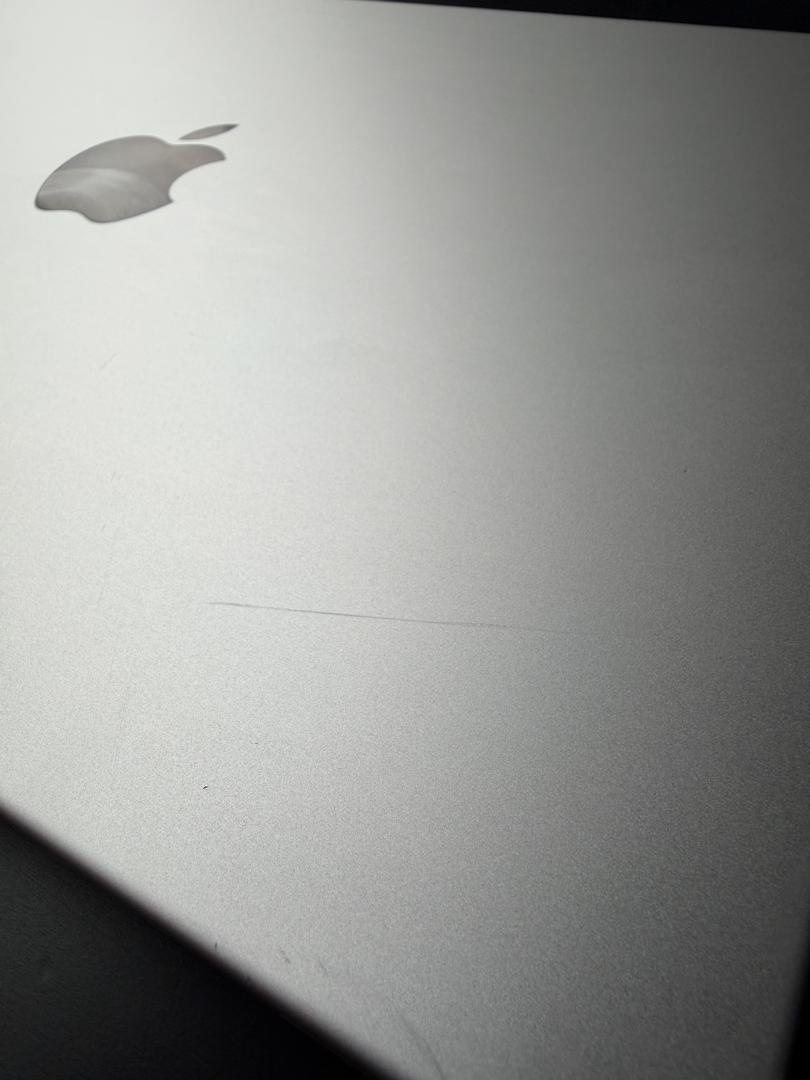 Minor scratches on the front of MacBook near Apple logo, and near USB-C ports on left side.