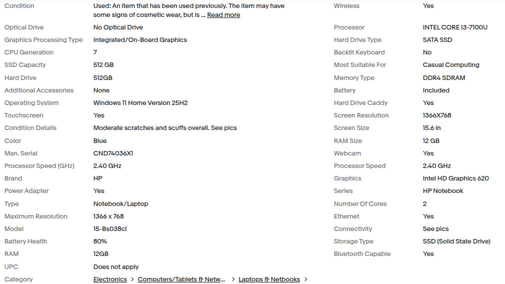 Used in overall good condition with moderate scratches around body , lid and bottom cover. Nothing extreme. Actual pics. Comes with genuine HP power adapter. Battery Health at 80%. More specs shown in specs chart included in pics.