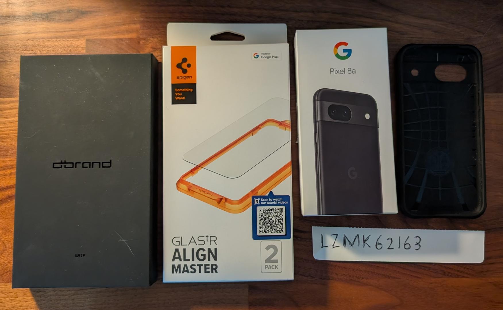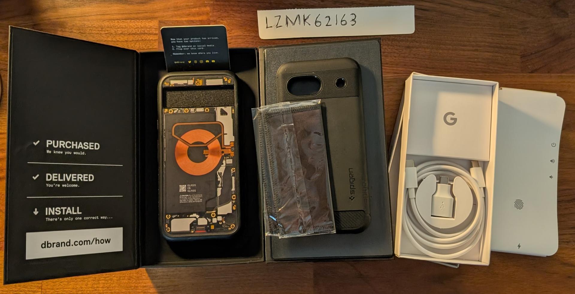 Minimally worn Pixel 8a that has lived its entire life in a Premium DBrand Grip Case, with Teardown Skin Applied. Included EXTRA Spigen Tempered Screen Protector with Alignment Tool. Also includes ORIGINAL Box, Cable, USB OTG Adapter, and Documentation. Also includes spare Spigen Case if you would like something a bit more low profile.