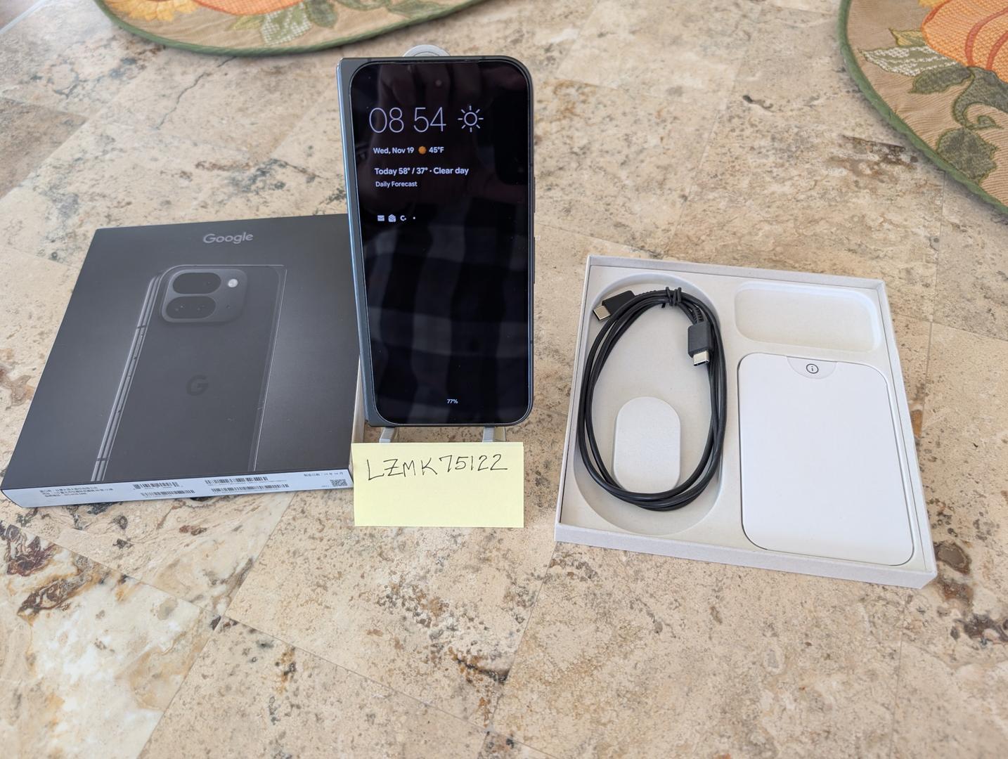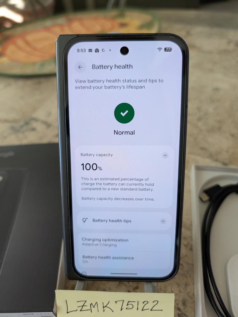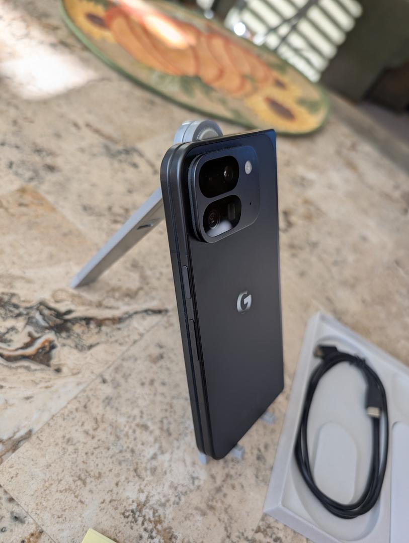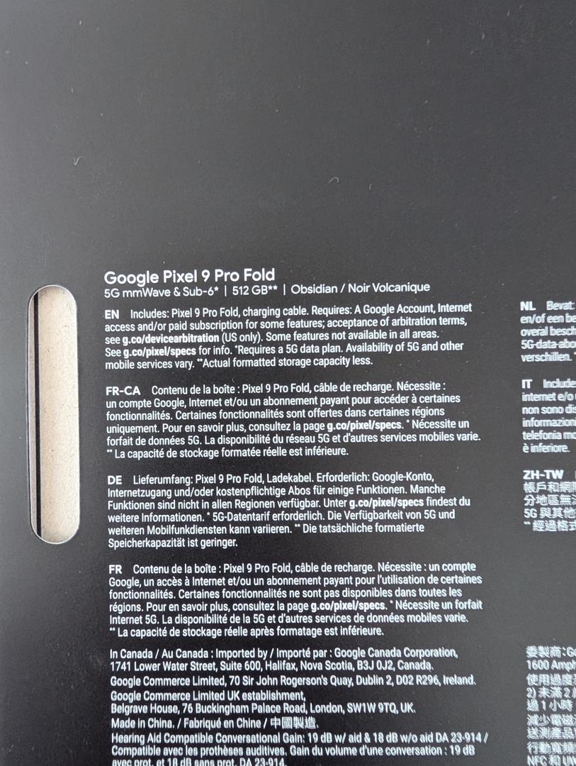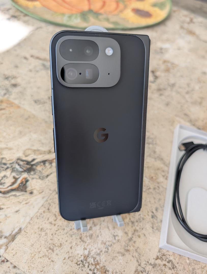 One-Owner 512GB Pixel 9 Pro Fold in Obsidian. Zero signs of usage or wear. Exterior and interior displays have no scratches or marks. Battery health is normal and battery capacity is 100%. Phone is unlocked and will work with any carrier. Includes the original box and a USB-C charging cable.