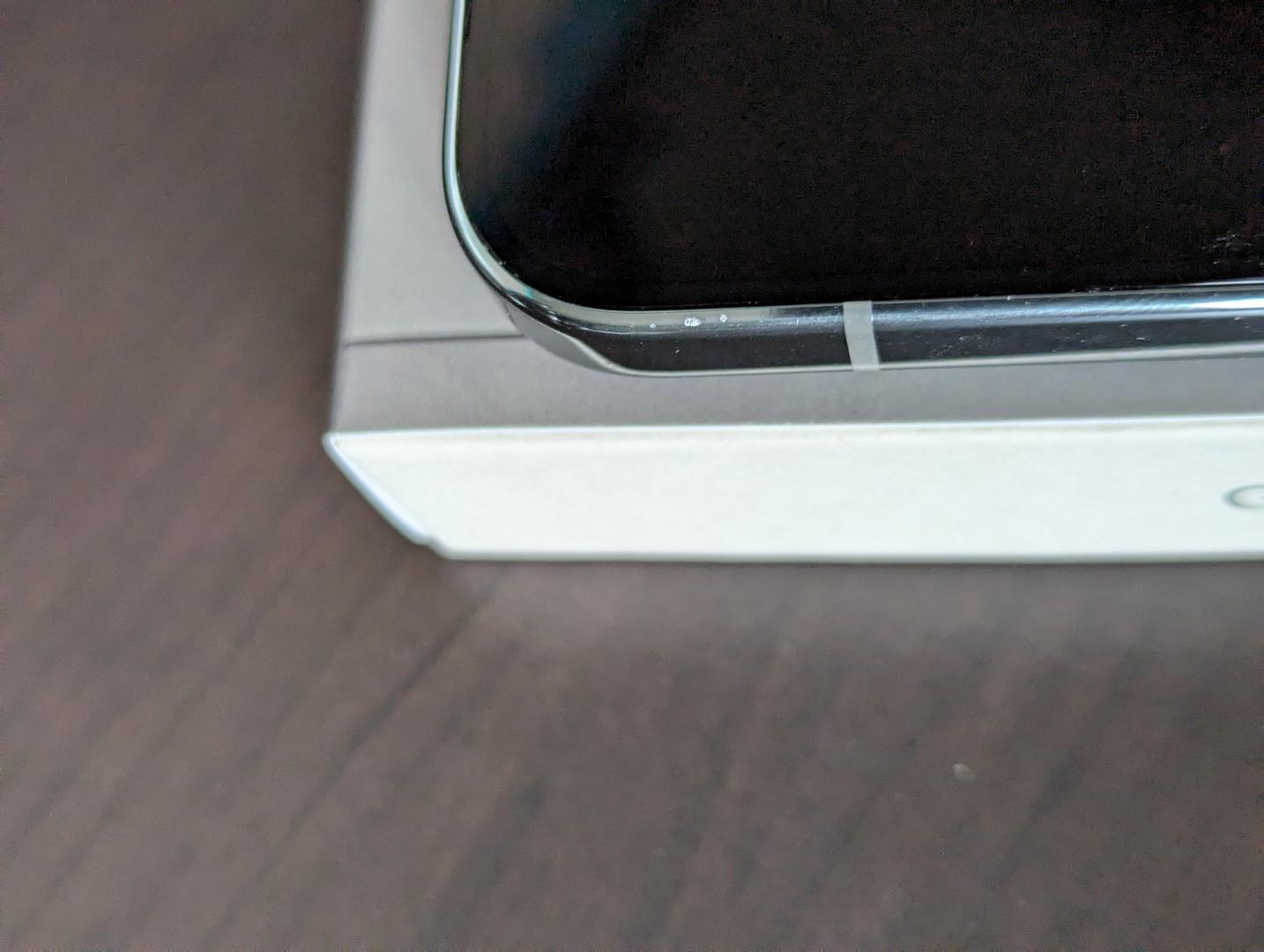 Minor surface scratch on the metal bezel near the top-left corner (see picture). It’s shallow and only visible under direct light