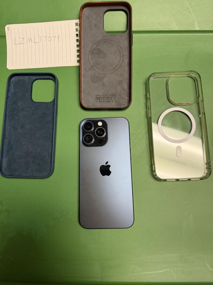 iPhone 15 Pro max Blue 256GB. No marks or scratches. 86% battery. Accessories included. Glass screen protector still on and no cracks. Comes with 3 cases: Clear hard plastic, Apple silicone Blue, Keyway brown leather. All cases are magsafe. Will ship within 48 hours