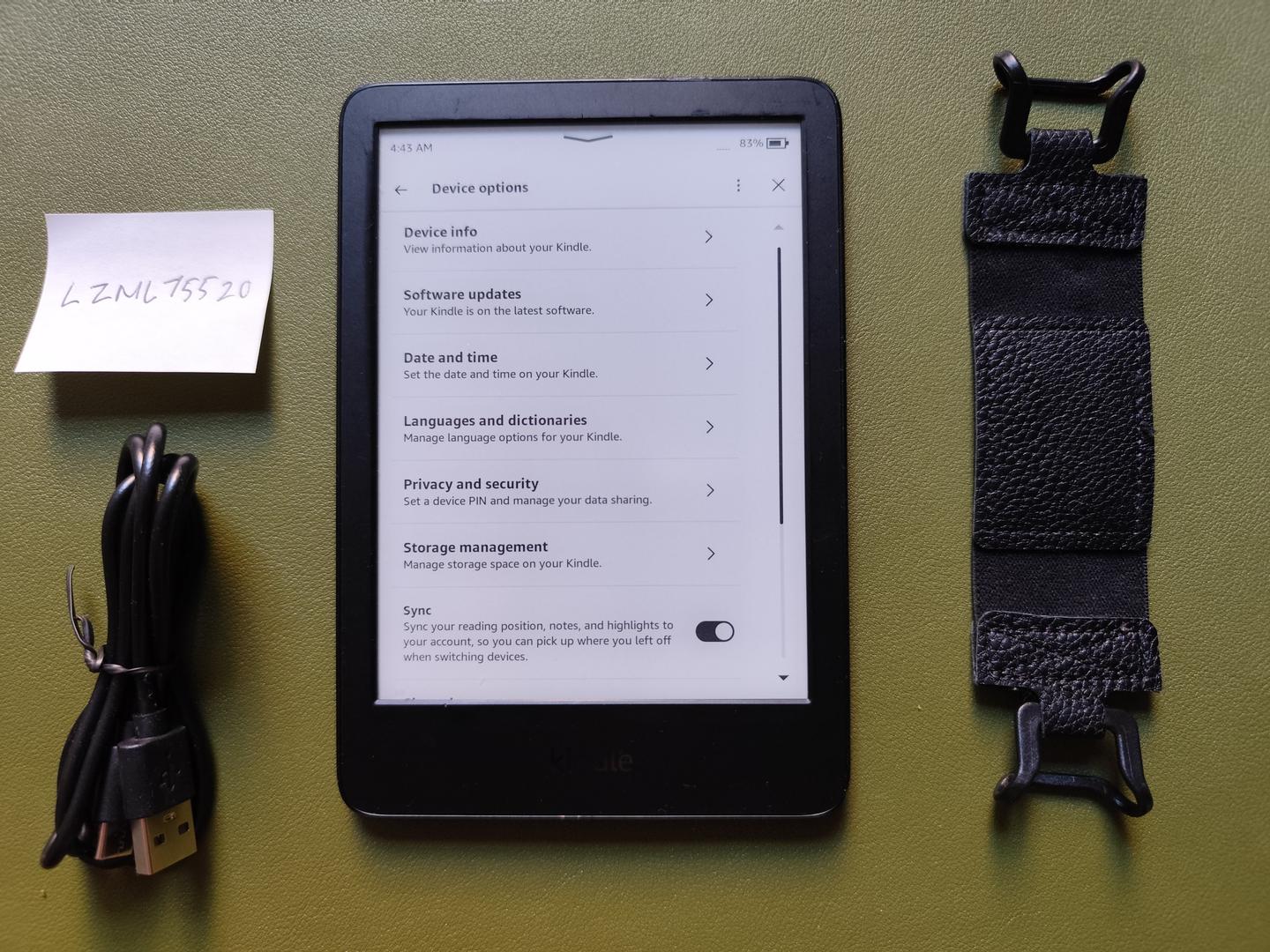 Includes a charging cable. Will throw in a reading strap.