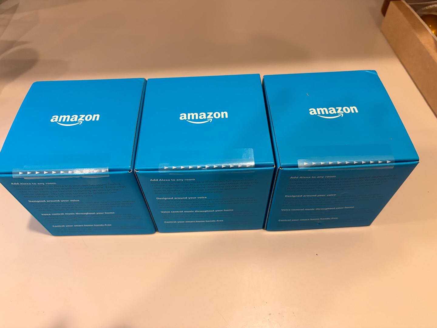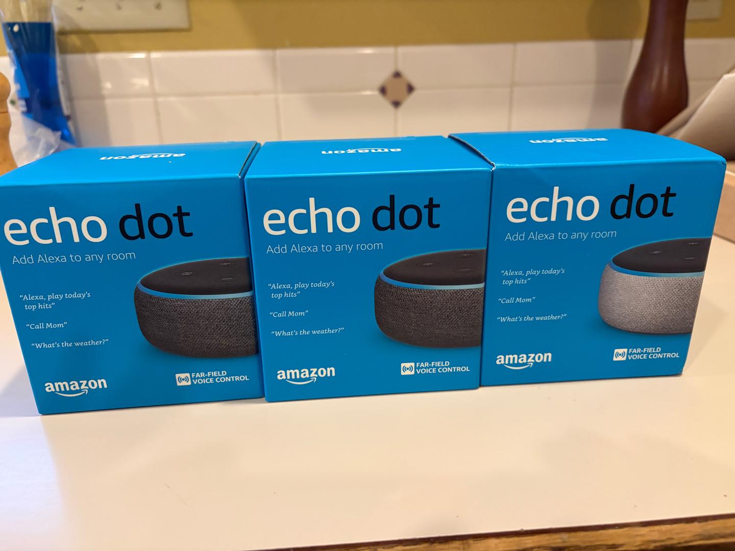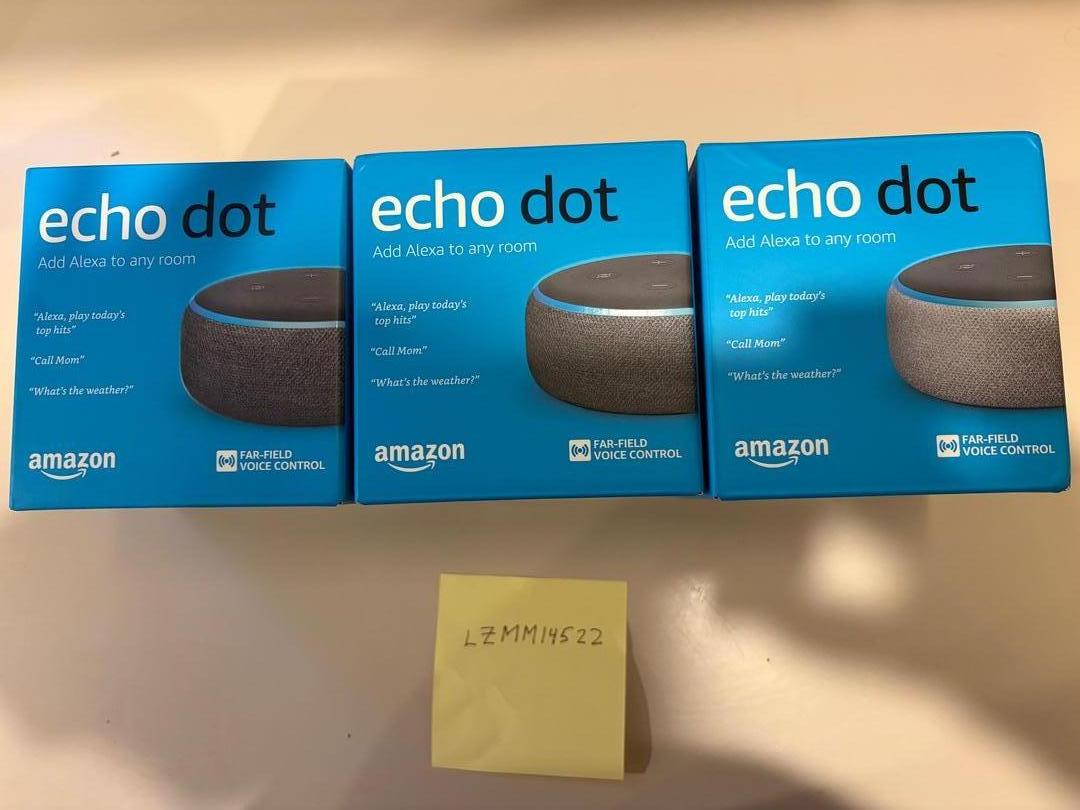 PRICE REDUCED! Brand new, factory sealed. Charcoal (2) and Gray (1) Amazon Echo Dot, 3rd Generation.