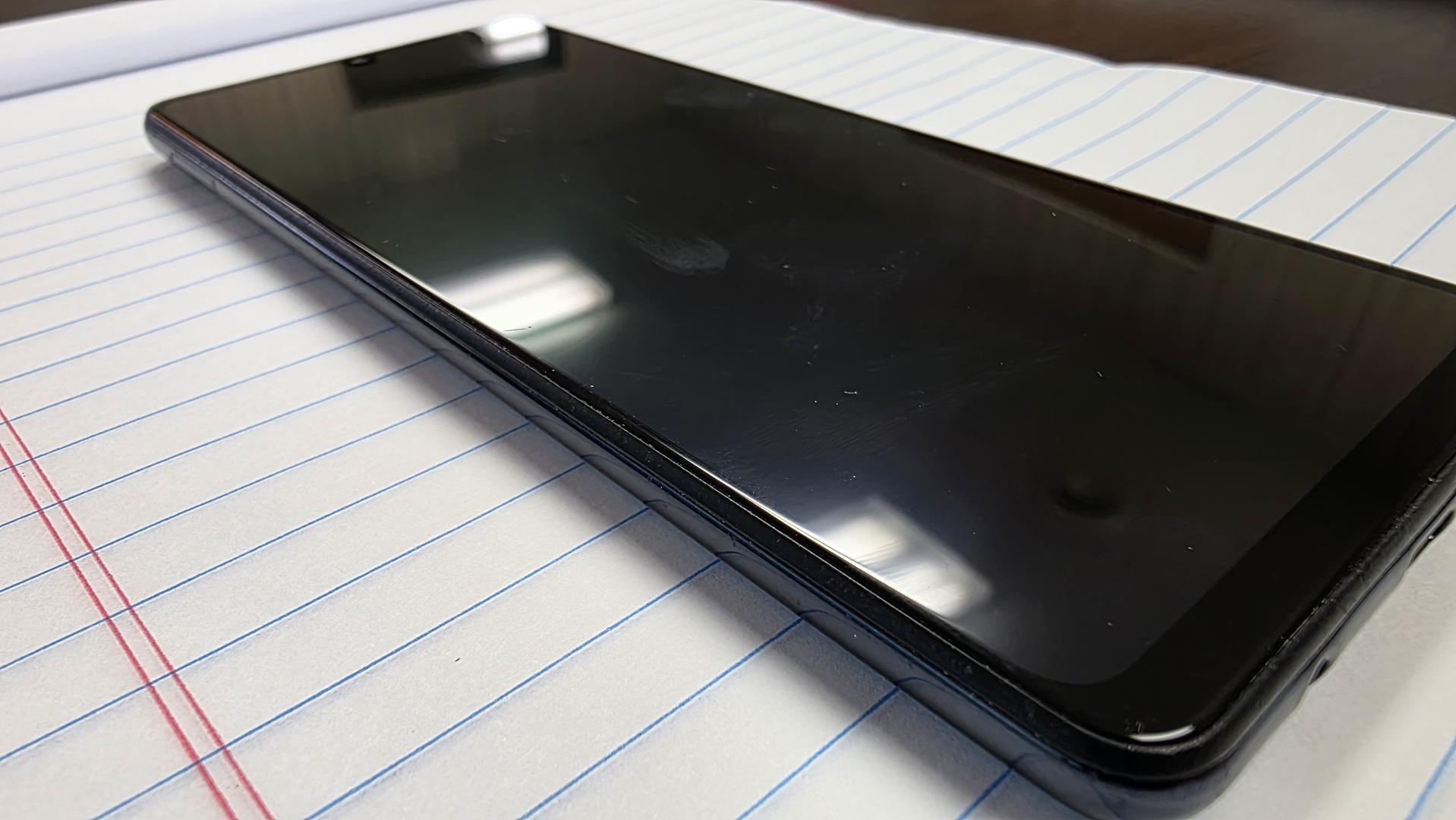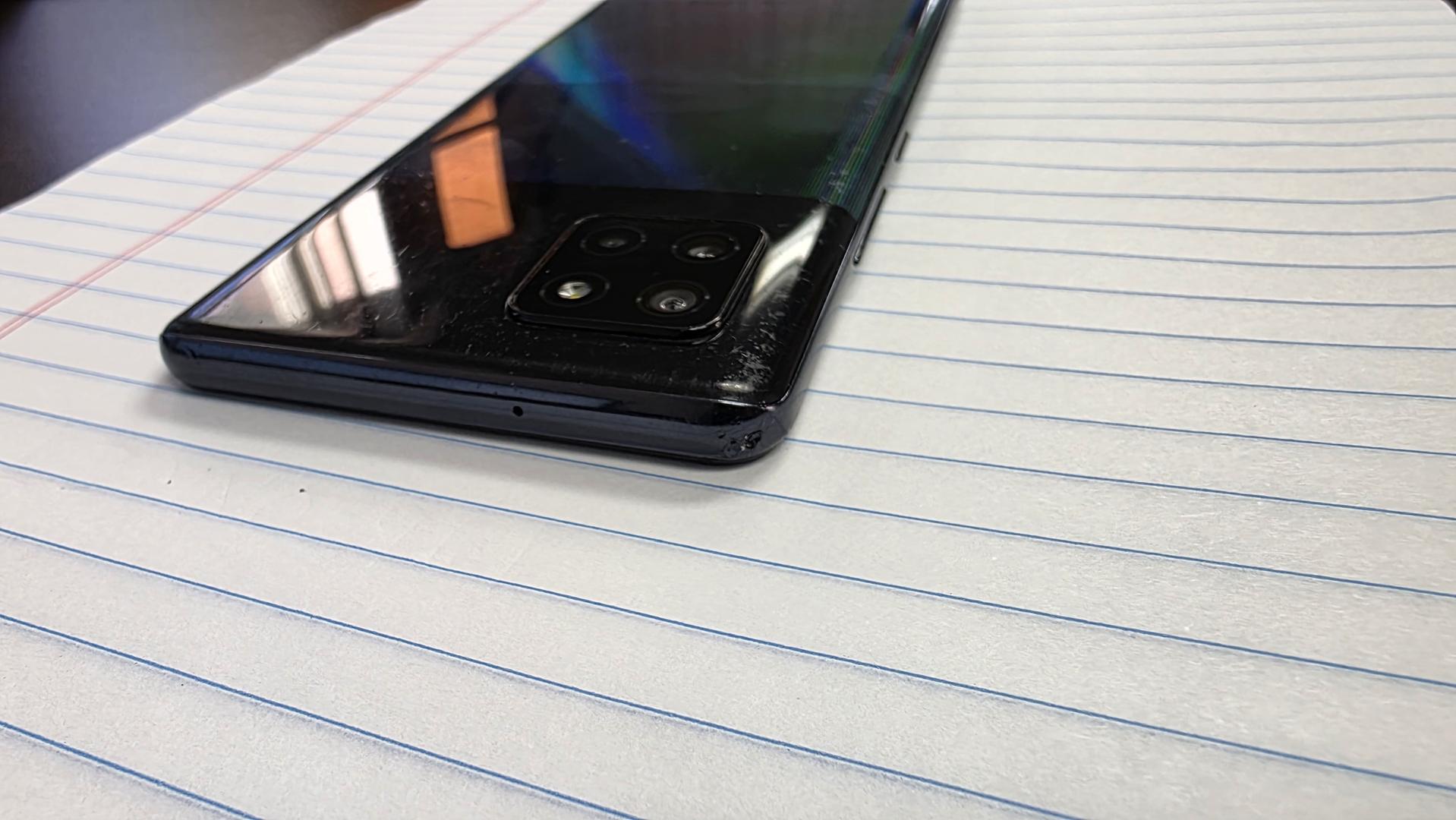 The phone has normal wear and tear from usage. Visible dent in one corner. The screen doesn't have any obvious scratches. The back is not pristine, shows wear.