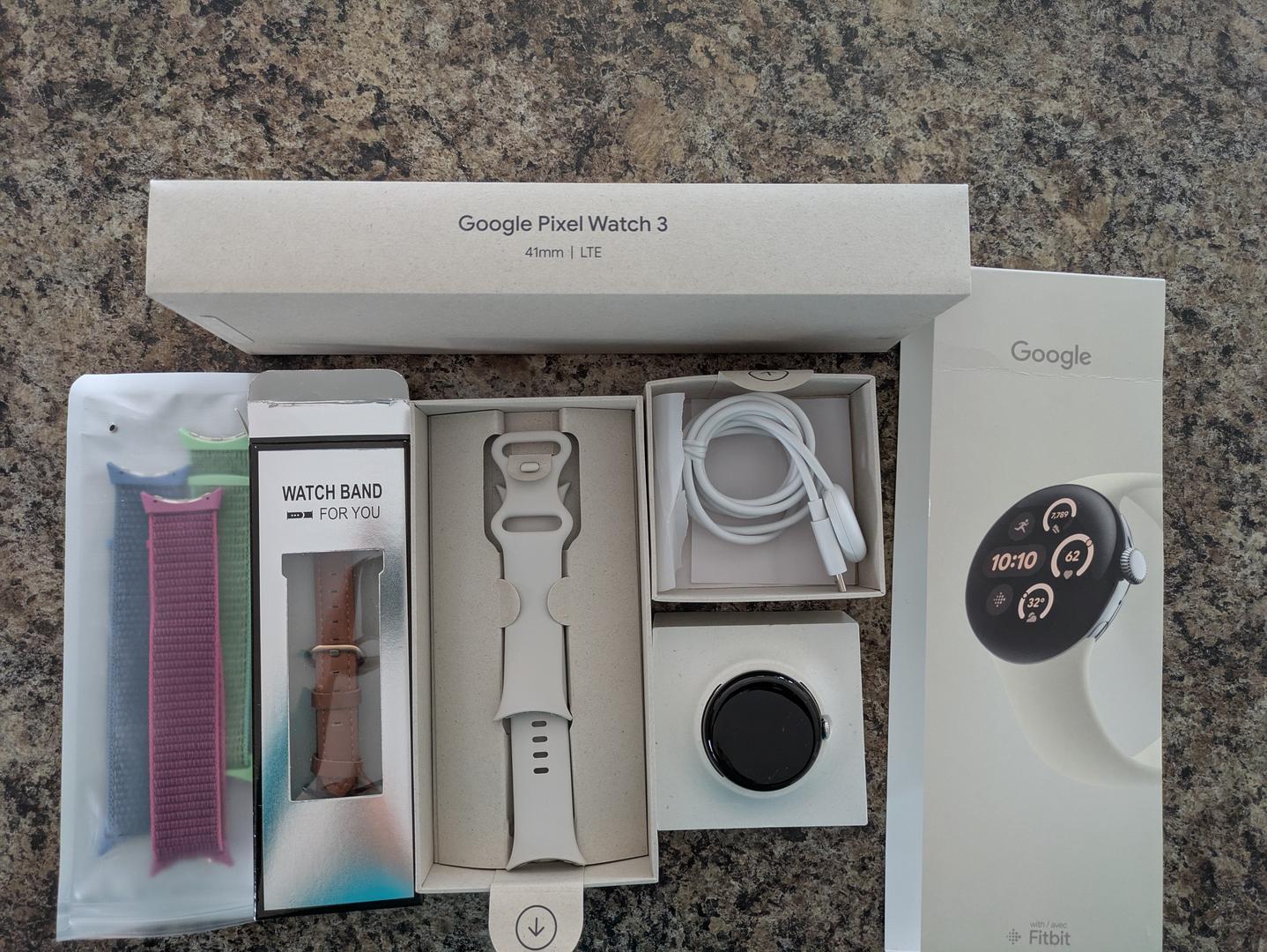 Google Pixel 3 LTE. Very little wear. The watch is in perfect condition. I have very small wrists. The original band/strap is included of course. Also an additonal brown leather strap and three flexible straps with Velcro closure.