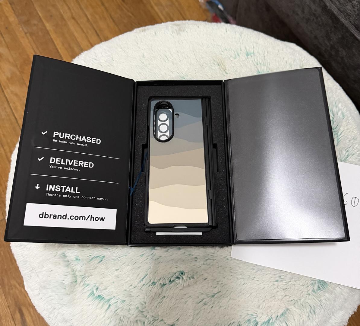 Moving on from this Z Fold7, which is in Like New, Mint condition. You'll receive the original packaging and accessories, phone, a DBrand case, and a set of DBrand screen protectors. The device already has a screen protector on it as well, with some very light scuffing. The hardware of the phone itself is pristine.