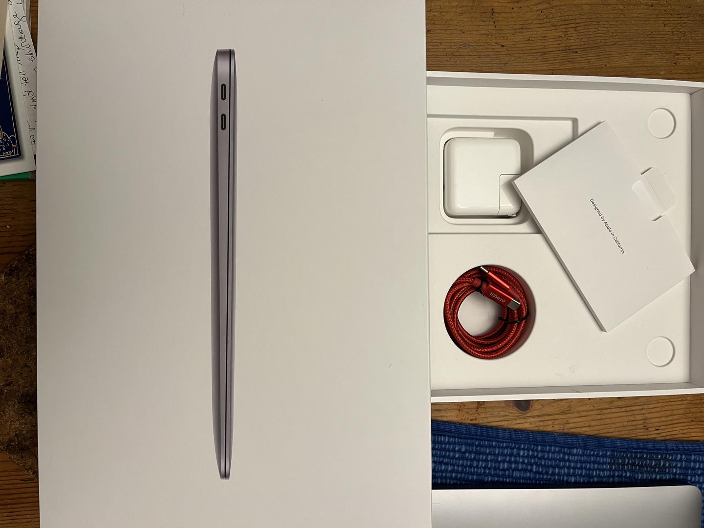 Original charger and box. Anker braided USB-C power cord.