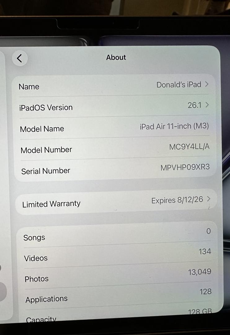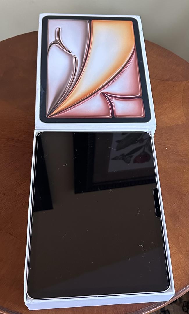 In use since for 3 months, since August 2025, and in excellent, like new, condition. Retail MSRP: $600. I also own an IPad Pro and tend to gravitate to that. Includes a screen protector, which has always been on the screen. The product is a lightly used Apple iPad Air 11" with 128GB of storage capacity and a 6th generation Apple M3 processor. It features a 11-inch Liquid Retina display with a maximum resolution of 1640x2360, making it perfect for streaming videos or working on the go. The tablet is lightweight at 1.01 lb and the 11” size makes it easy to carry and use for extended periods. Have the original box. This would be an excellent holiday gift for someone!