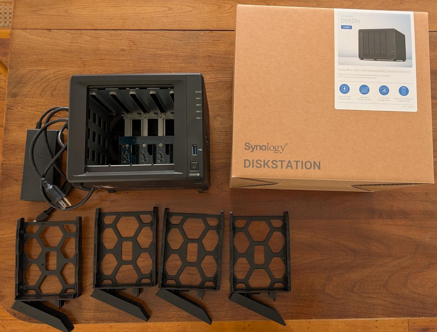 Excellent condition Synology DS920+ 4 bay NAS. I added 8GB of RAM to bring the total to 12GB. This is perfect for running a Jellyfin/Plex server, Pi-hole, Home assistant, and other Docker containers, besides obviously being great for data backup.