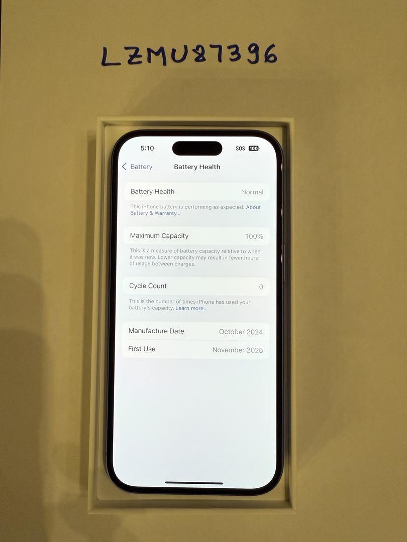 100% Battery health, cycle count is 0.