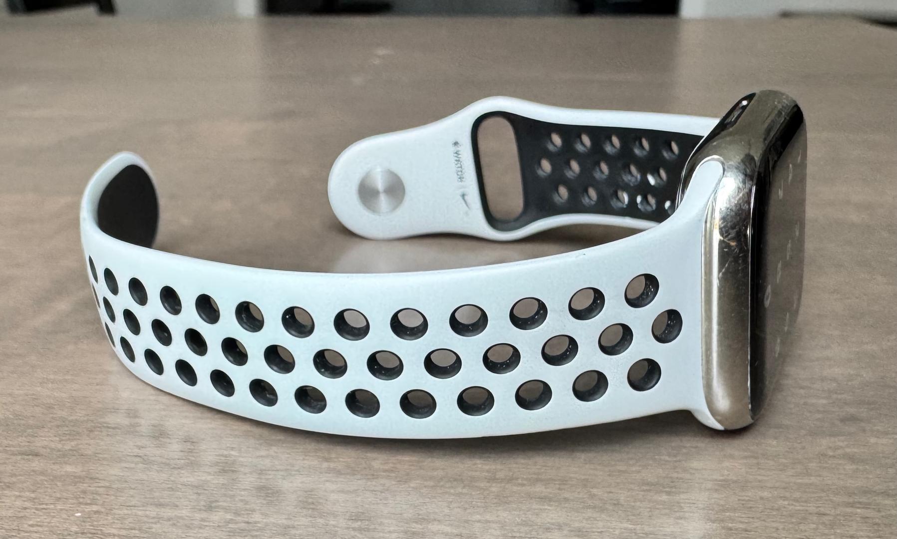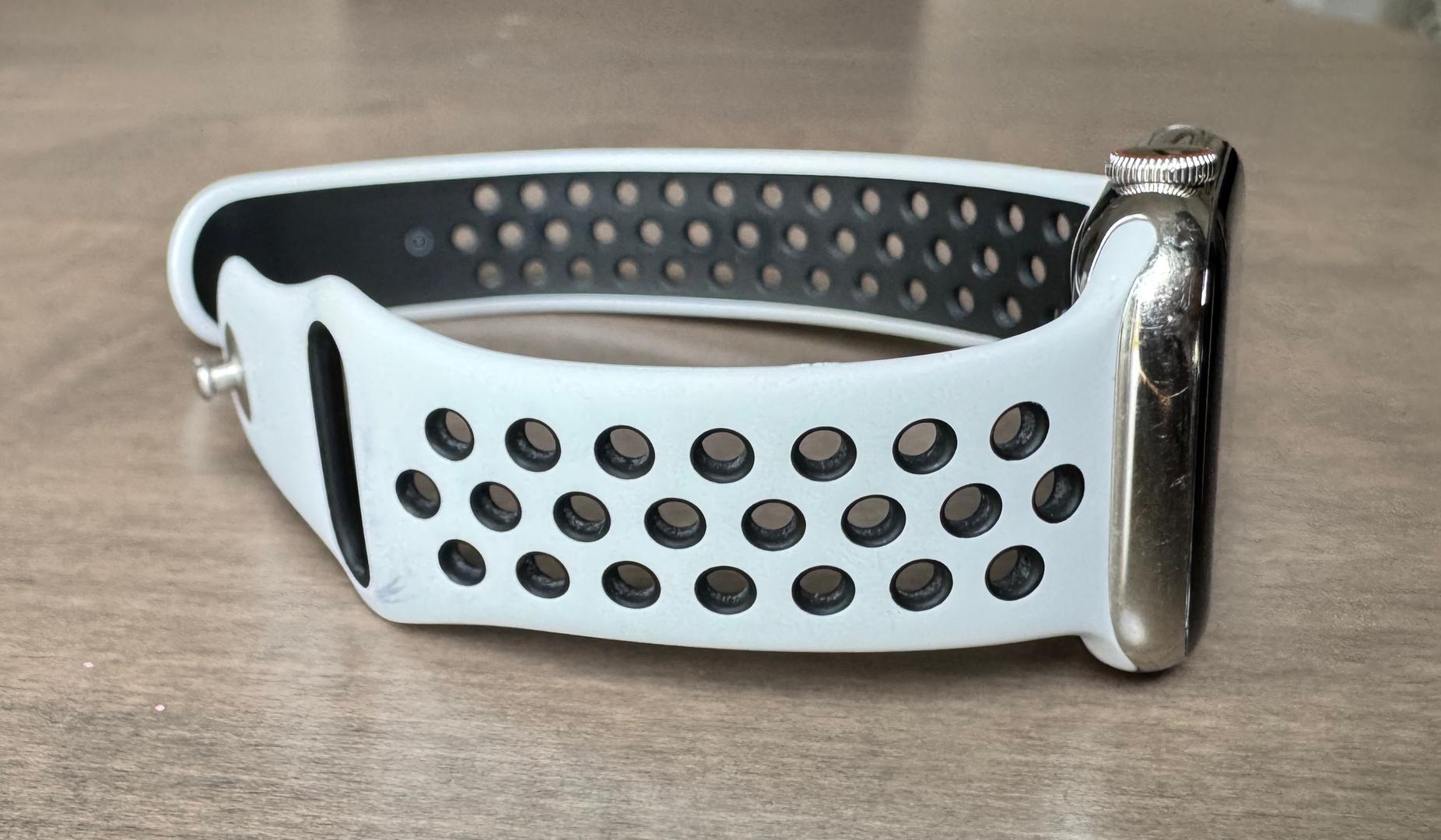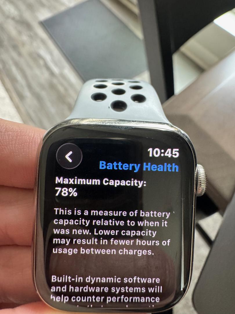 Good condition, battery says needs attention and is listed at 78% condition. I wear it 24 hours a day for sleep tracking and it works great. I do top it off once or twice a day at times. Generic/third party Fast charging cord included. Watch band is an Apple Nike band.