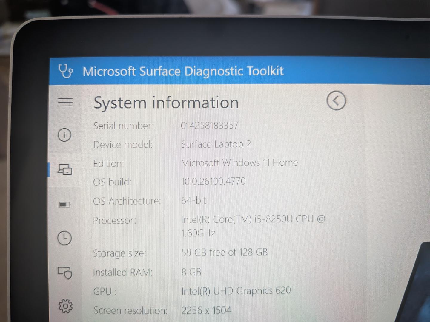 Microsoft Surface Laptop 2, intel i5, 8GB RAM, 128GB SSD, Windows 11