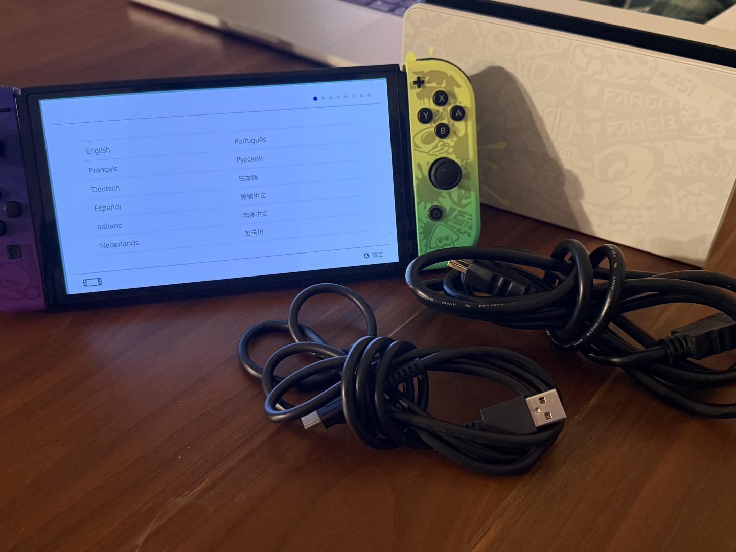 Includes Splatoon joycon, console, dock, power cable and HDMI cable
