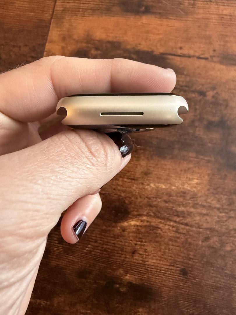 The only wear is minor, light scuffing on the aluminum case, specifically limited to the narrow edges where the band connects. This is purely cosmetic wear from normal use.