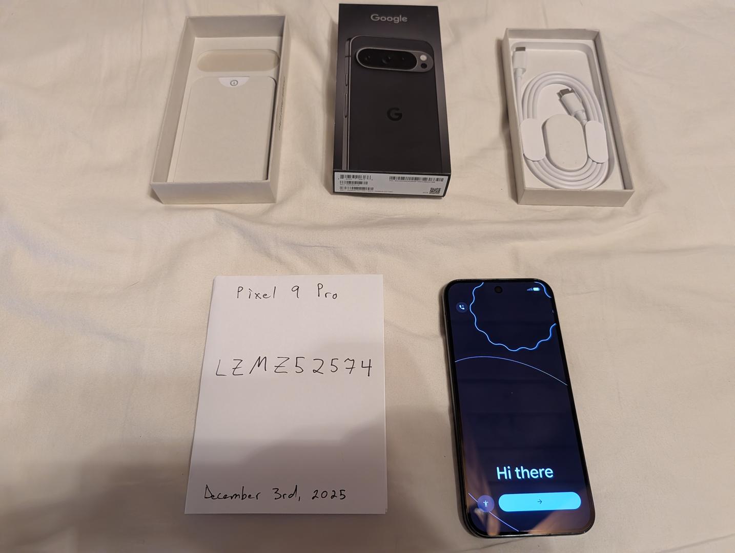 Very lightly used and adult owned Pixel 9 Pro. This is the Obsidian Colorway with 128gb storage. Very good overall condition and includes original box/manual/cable. Purchased unlocked directly from Google. Have upgraded and no longer need this one - would like to pass it along!