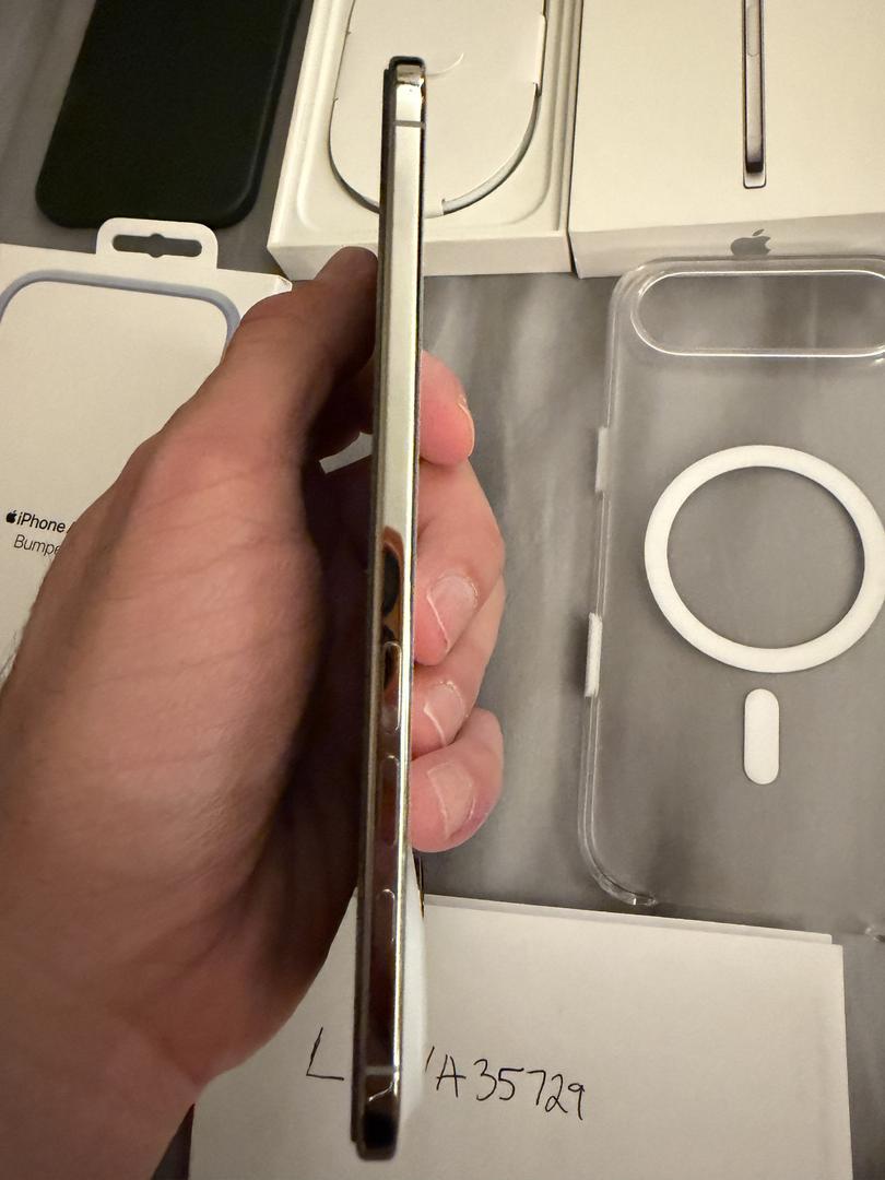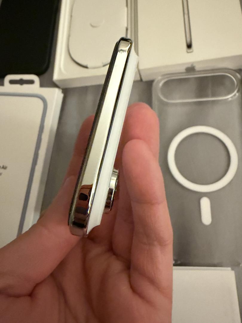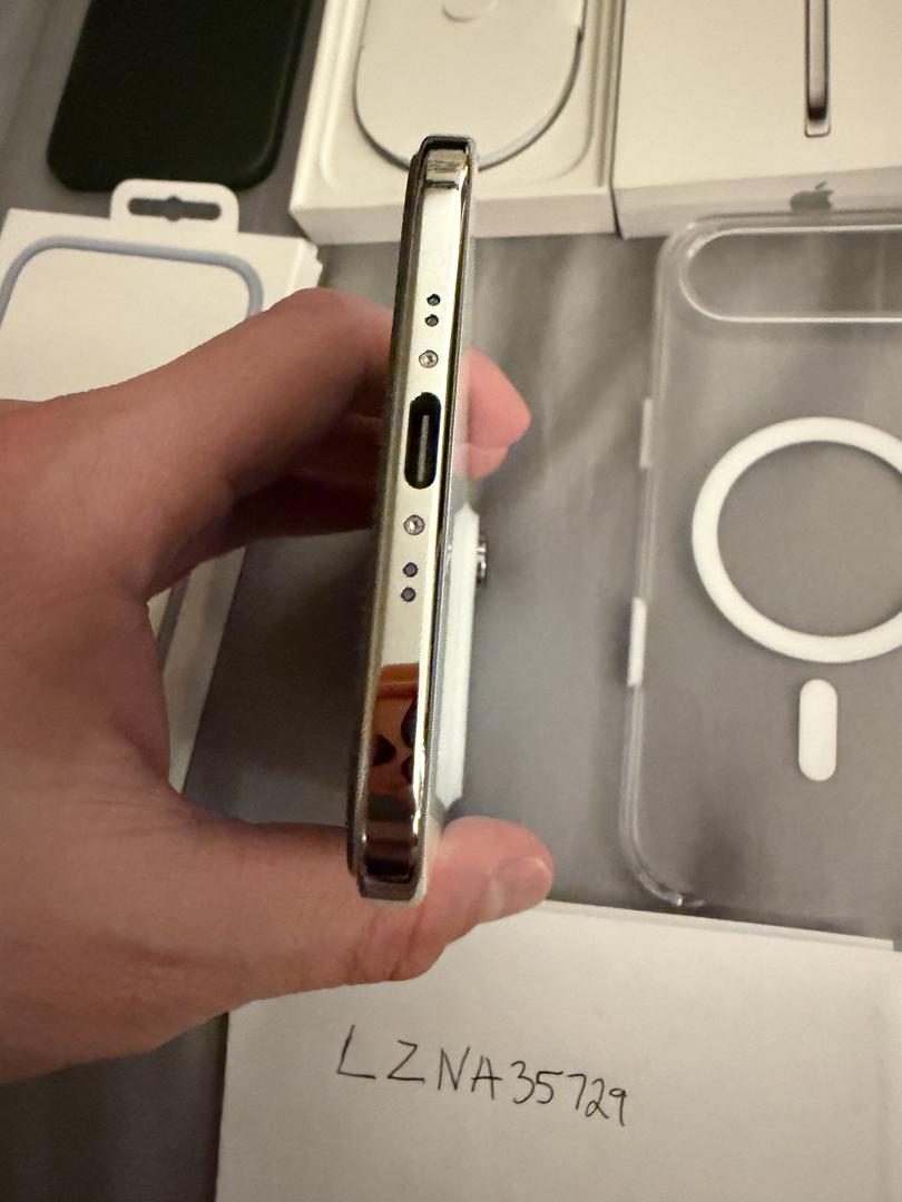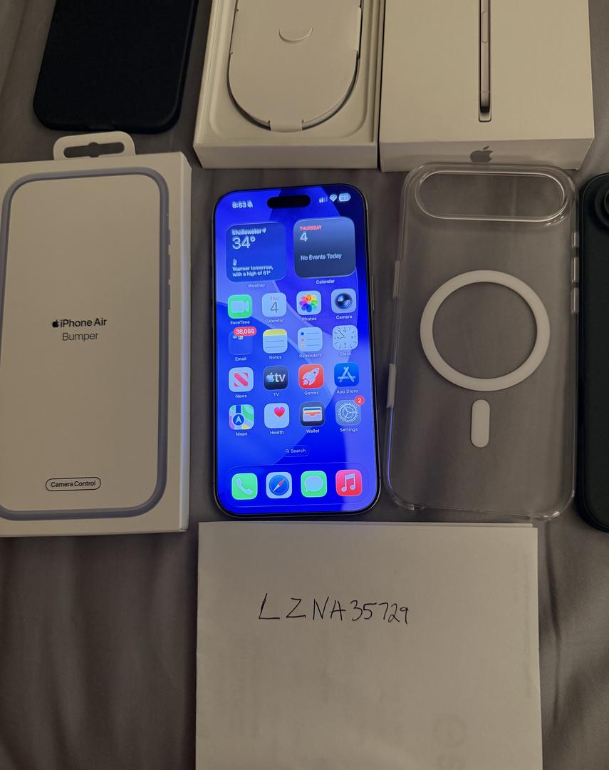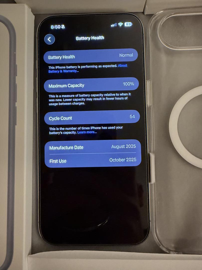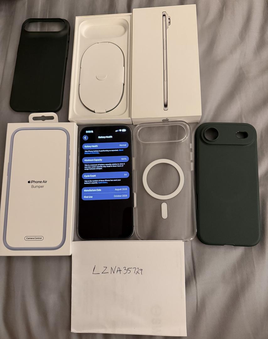 Phone is in mint condition. Current screen protector installed has bubbles but I will include replacement screen protectors. Cycle count is 54 and first use date was 10/2025. Includes 3 cases and official Apple blue bumper case. Box included with unused usb cable.