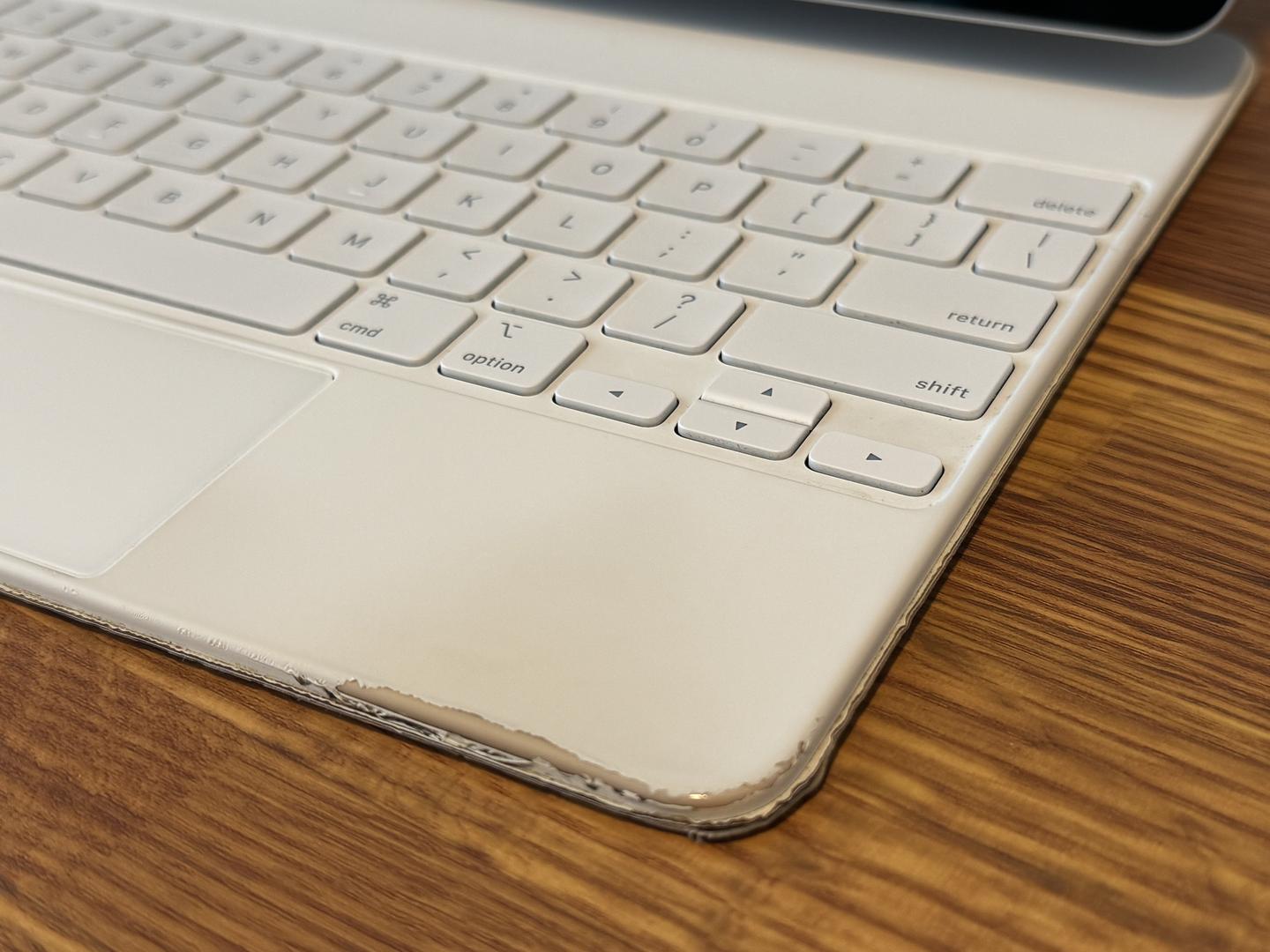 The Magic Keyboard functions perfectly—keys, trackpad, hinge, and magnets all work as expected. It shows normal cosmetic wear on the outer edges and palm rests from regular use, but nothing that affects performance.