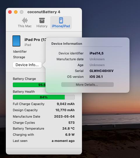 The iPad is in excellent condition with a clean screen, no dents, and smooth performance. Battery health is 84% (verified with coconutBattery). It lived in the Magic Keyboard case for its entire use, so the body stayed well protected.
