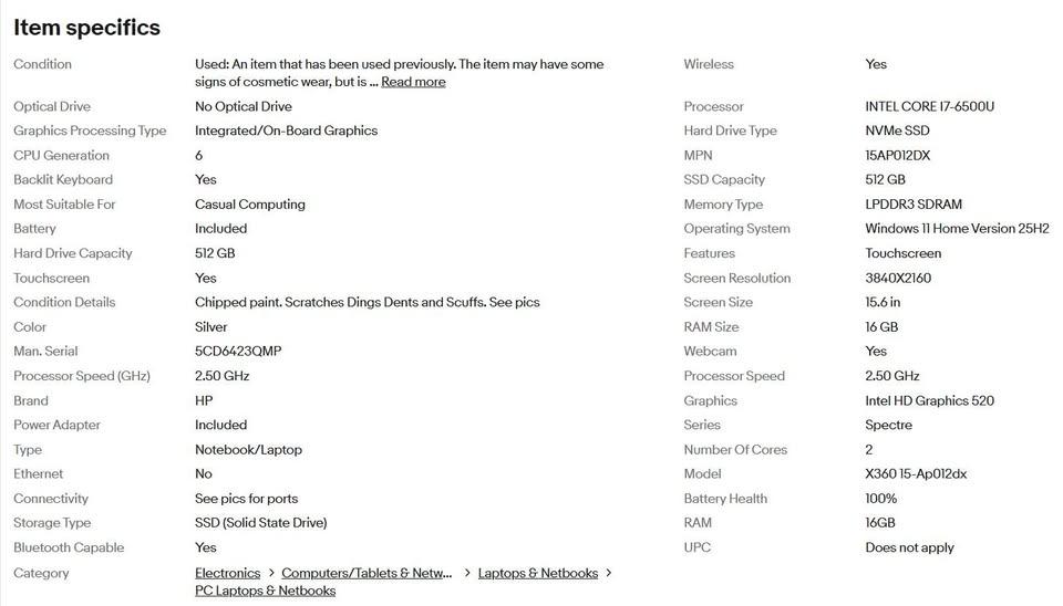Used with moderate scratches, light dings and dents as shown in pics. Some paint peeling on lid as shown. Wear on body, lid and bottom cover. Overall still good condition and fully functional. Actual pics. Comes with genuine HP power adapter. Battery Health at 100%. More specs shown in specs chart in pics. Windows 11 Home 25H2 Touchscreen