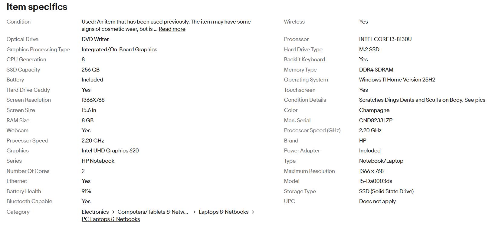 Champagne color. Used in overall good condition with mild to moderate scratches or scuffs as shown, nothing major. Mild scratches mostly on lid but very mild. Actual pics. Comes with genuine HP power adapter. Battery Health at 91%. More specs shown in specs chart in pics.