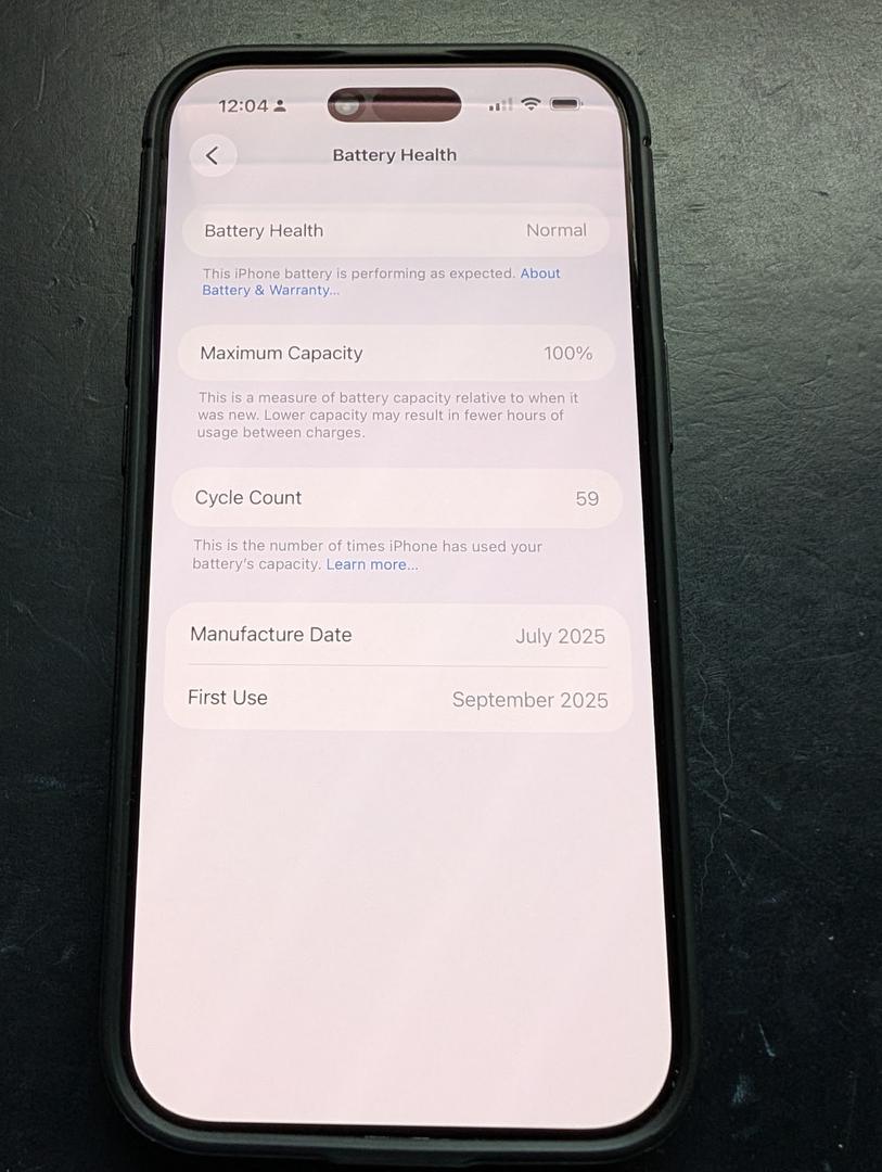 - Battery health 100%. Cycle count 59