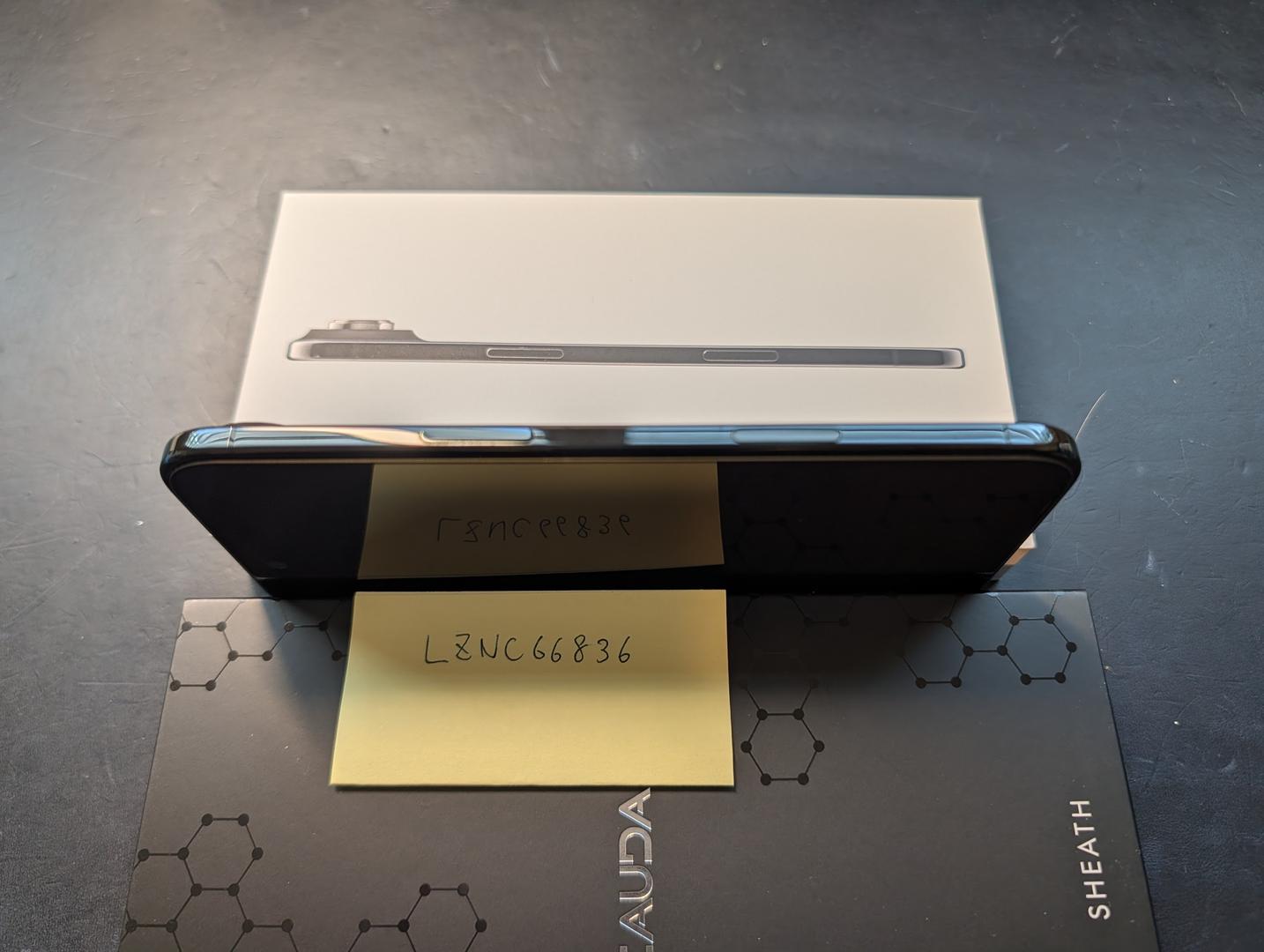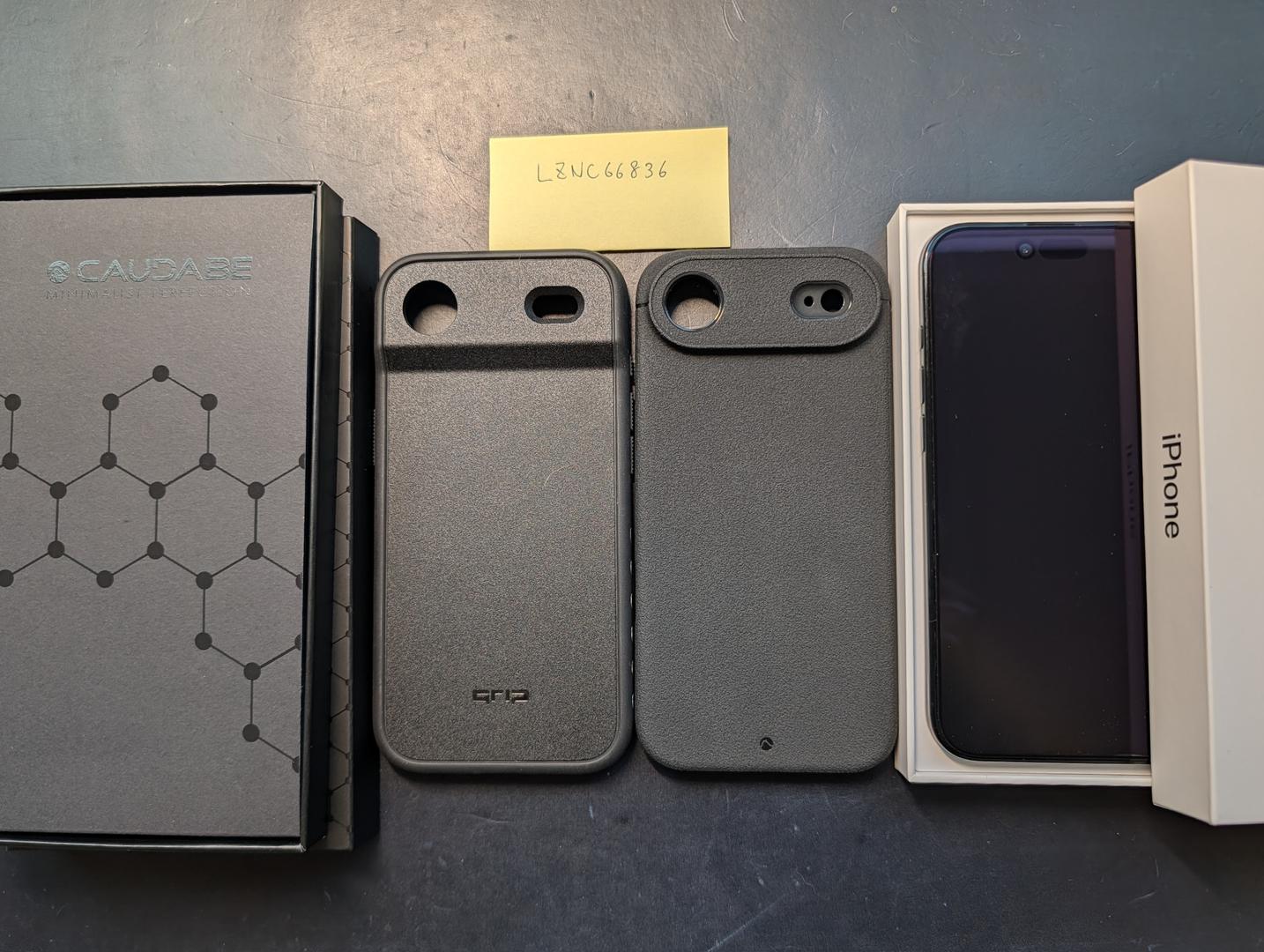 - Two cases: Caudabe Sheath Black (w/ box) and Dbrand Ghost (no box)