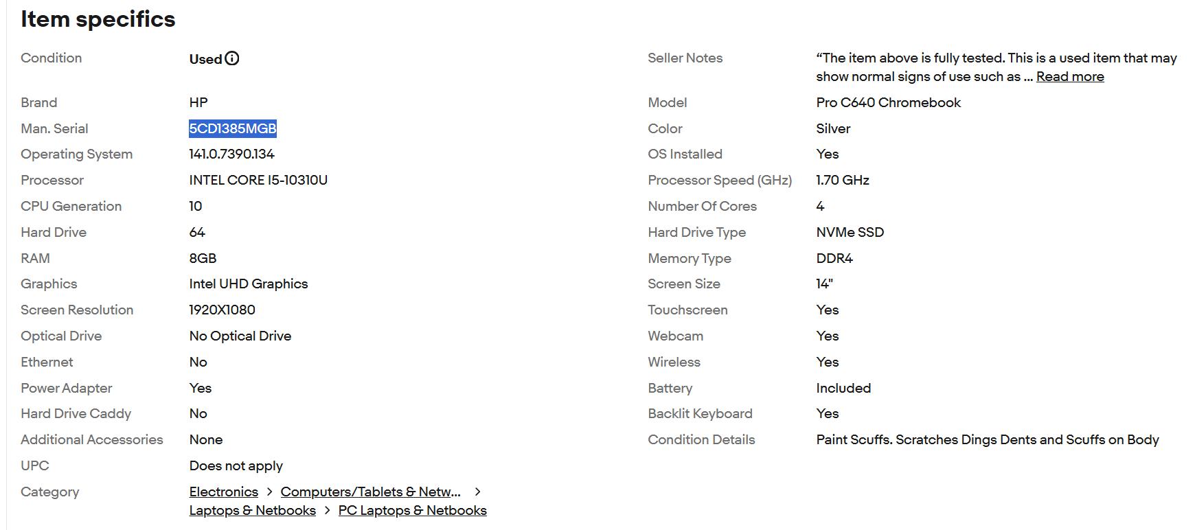 14" HP PRO C640 CHROMEBOOK INTEL CORE i5-10310U 1.70GHZ 64GB 8GB TOUCHSCREEN